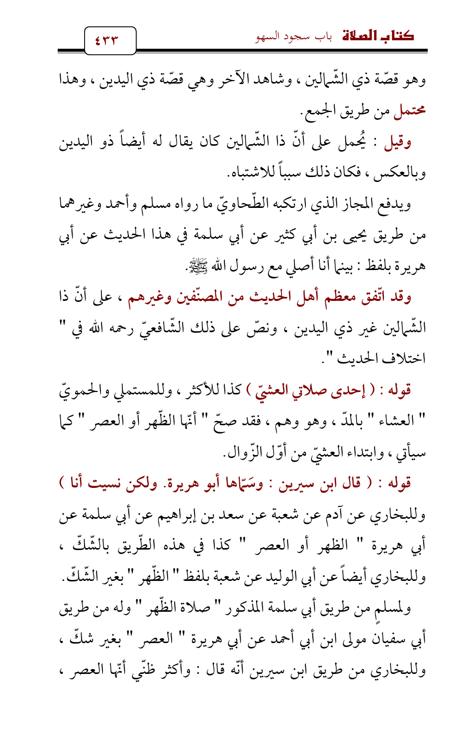 قوله: (قال ابن سيرين: وسَمّاها أبو هريرة. ولكن نسيت أنا) وللبخاري عن آدم عن شعبة عن سعد بن إبراهيم عن أبي سلمة عن أبي هريرة " الظهر أو العصر " كذا في هذه الطّريق بالشّكّ، وللبخاري أيضاً عن أبي الوليد عن شعبة بلفظ " الظّهر " بغير الشّكّ.