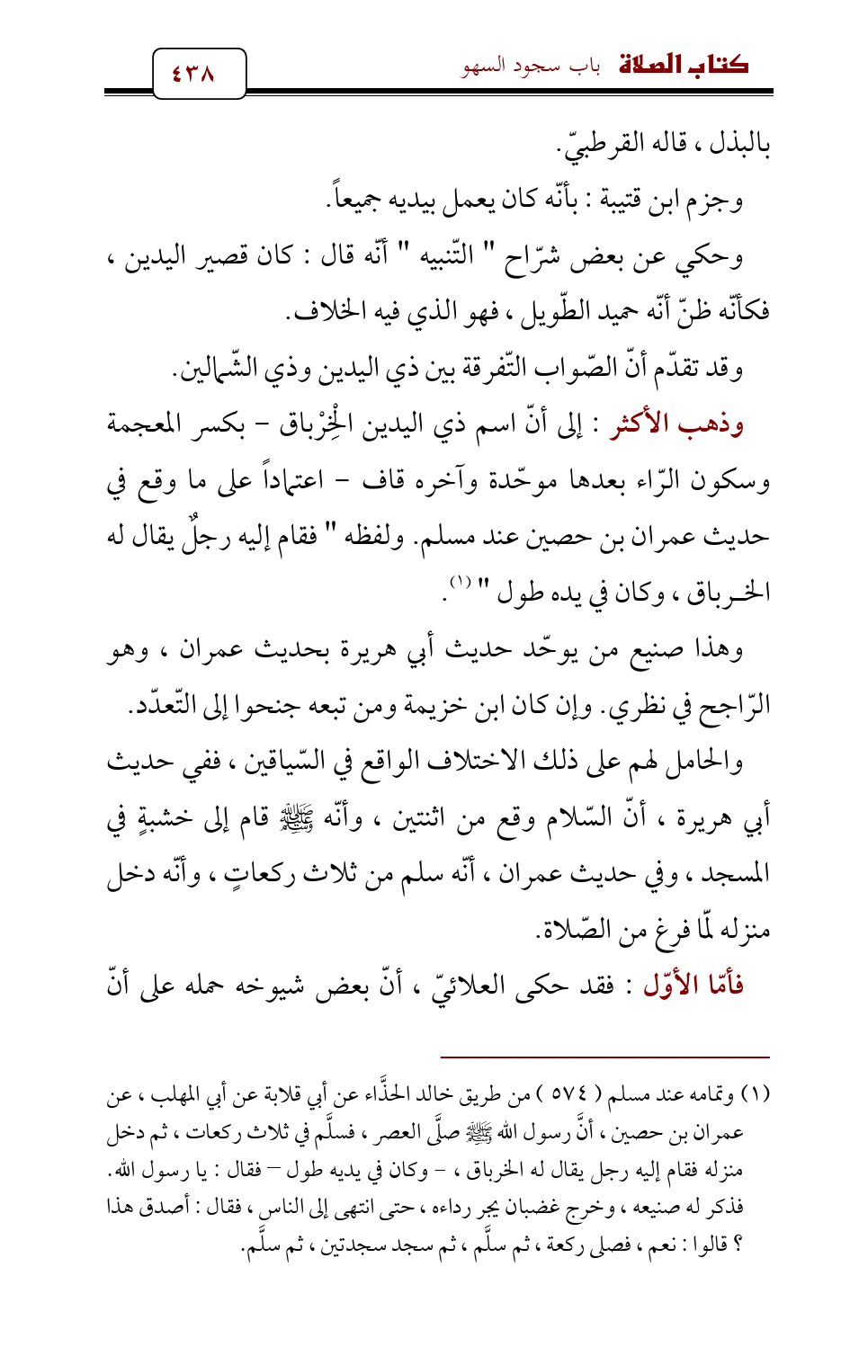 (¬1) وتمامه عند مسلم (574) من طريق خالد الحذَّاء عن أبي قلابة عن أبي المهلب، عن عمران بن حصين، أنَّ رسول الله - صلى الله عليه وسلم - صلَّى العصر، فسلَّم في ثلاث ركعات، ثم دخل منزله فقام إليه رجل يقال له الخرباق، - وكان في يديه طول – فقال: يا رسول الله. فذكر له صنيعه، وخرج غضبان يجر رداءه، حتى انتهى إلى الناس، فقال: أصدق هذا؟ قالوا: نعم، فصلى ركعة، ثم سلَّم، ثم سجد سجدتين، ثم سلَّم.