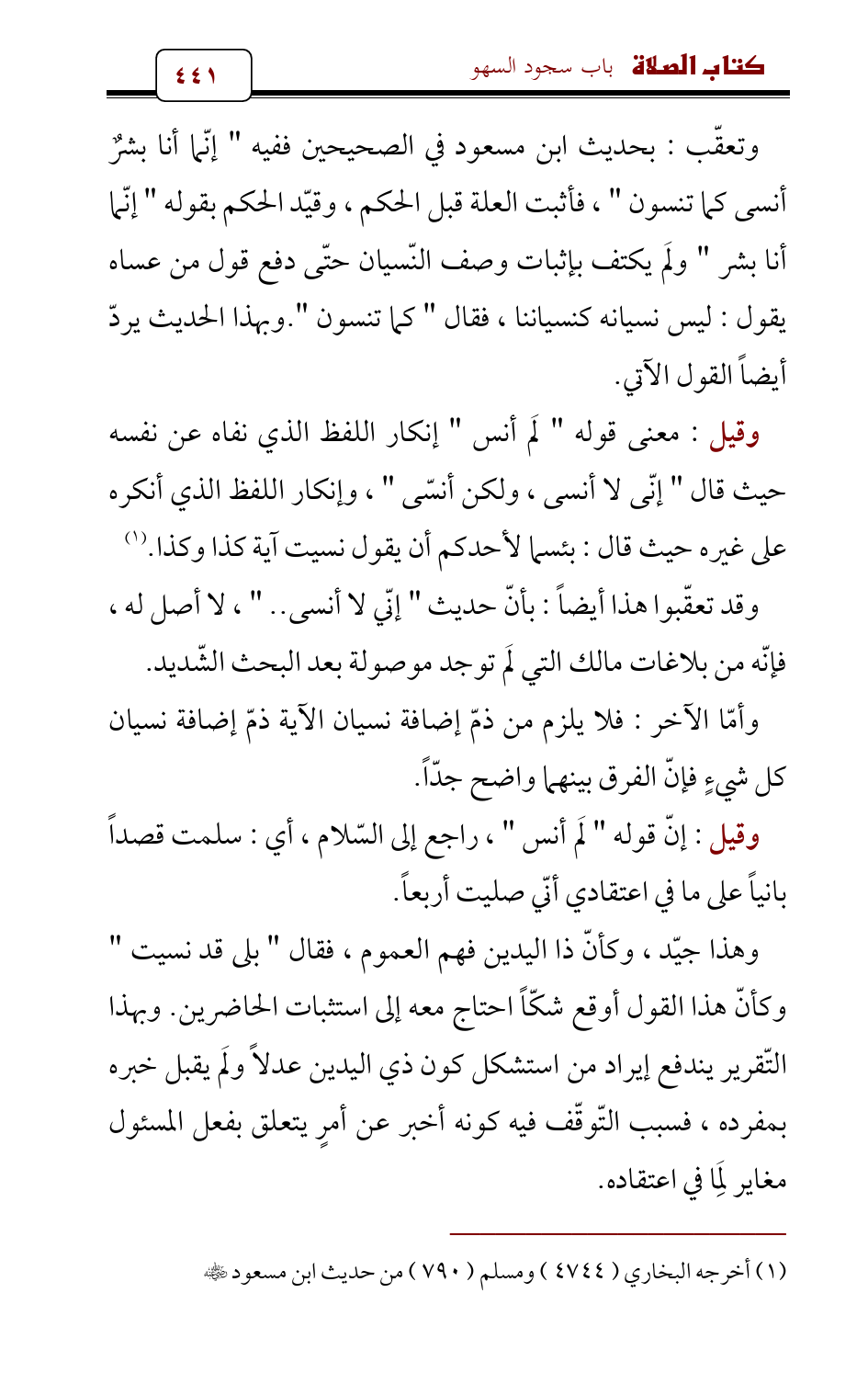 وتعقّب: بحديث ابن مسعود في الصحيحين ففيه " إنّما أنا بشرٌ أنسى كما تنسون " , فأثبت العلة قبل الحكم , وقيّد الحكم بقوله " إنّما أنا بشر " ولَم يكتف بإثبات وصف النّسيان حتّى دفع قول من عساه يقول: ليس نسيانه كنسياننا , فقال " كما تنسون ".وبهذا الحديث يردّ أيضاً القول الآتي.