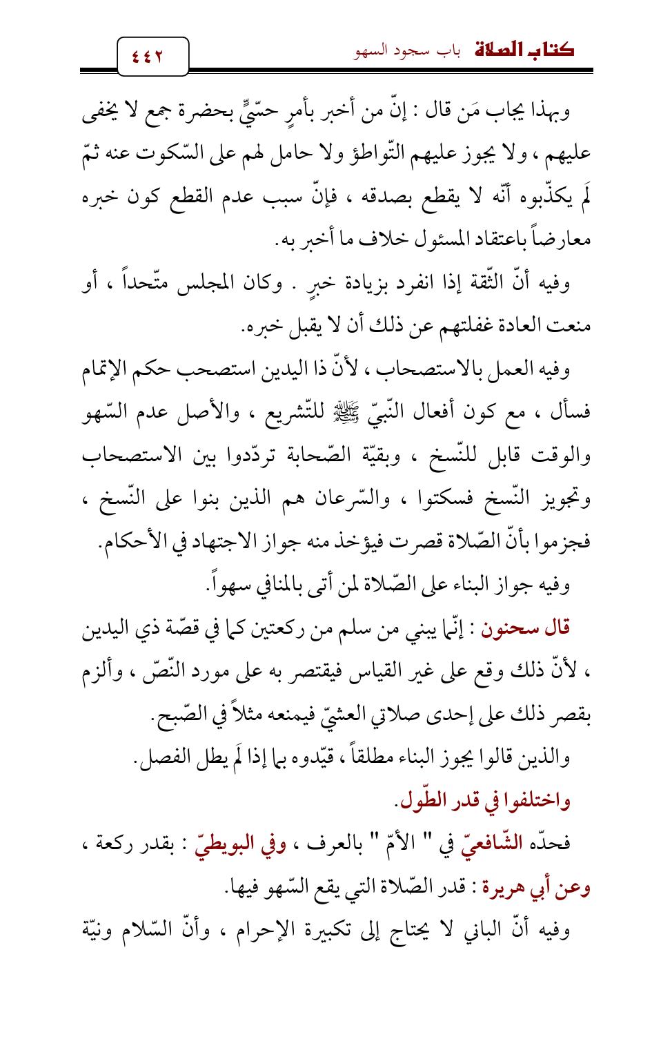 قال سحنون: إنّما يبني من سلم من ركعتين كما في قصّة ذي اليدين , لأنّ ذلك وقع على غير القياس فيقتصر به على مورد النّصّ , وألزم بقصر ذلك على إحدى صلاتي العشيّ فيمنعه مثلاً في الصّبح.