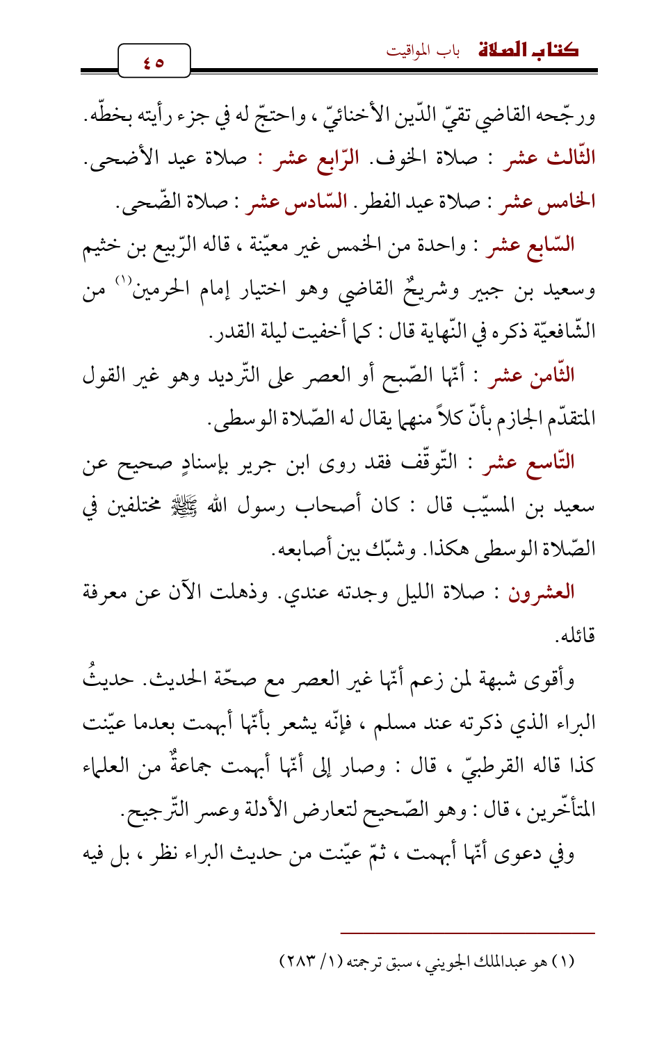 وأقوى شبهة لمن زعم أنّها غير العصر مع صحّة الحديث. حديثُ البراء الذي ذكرته عند مسلم , فإنّه يشعر بأنّها أبهمت بعدما عيّنت كذا قاله القرطبيّ، قال: وصار إلى أنّها أبهمت جماعةٌ من العلماء المتأخّرين، قال: وهو الصّحيح لتعارض الأدلة وعسر التّرجيح.