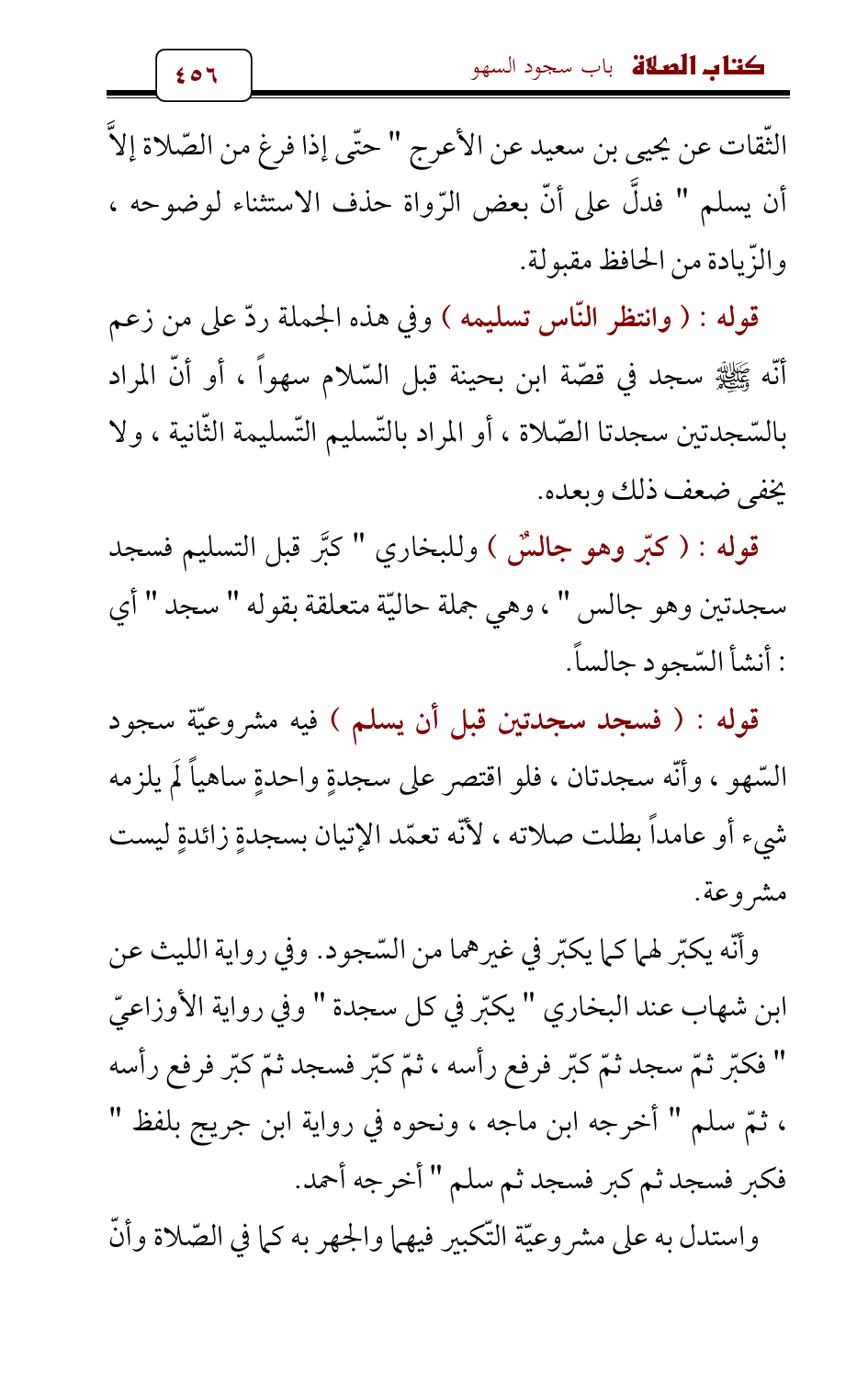 الثّقات عن يحيى بن سعيد عن الأعرج " حتّى إذا فرغ من الصّلاة إلاَّ أن يسلم " فدلَّ على أنّ بعض الرّواة حذف الاستثناء لوضوحه، والزّيادة من الحافظ مقبولة.