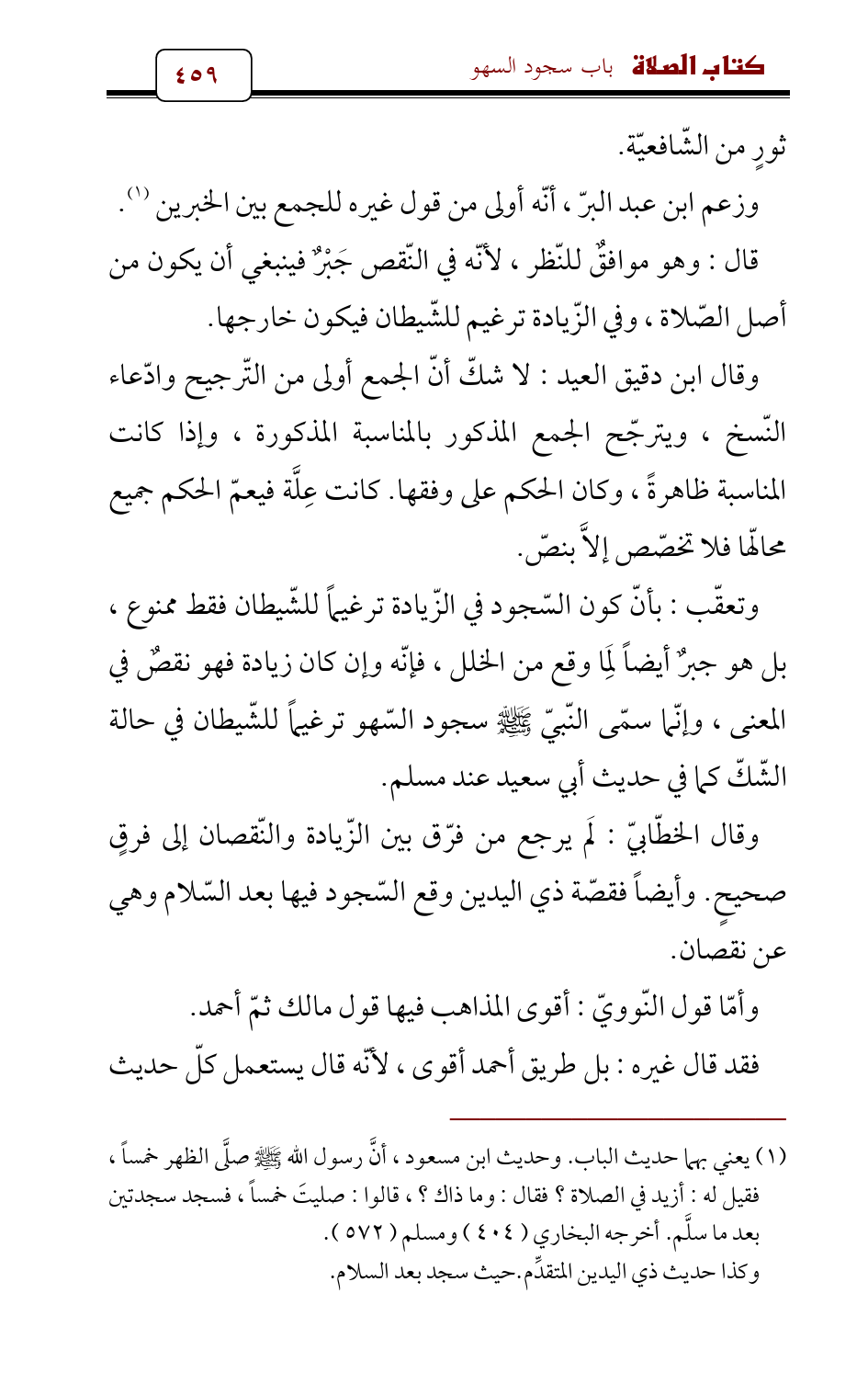 (¬1) يعني بهما حديث الباب. وحديث ابن مسعود , أنَّ رسول الله - صلى الله عليه وسلم - صلَّى الظهر خمساً، فقيل له: أزيد في الصلاة؟ فقال: وما ذاك؟ , قالوا: صليتَ خمساً، فسجد سجدتين بعد ما سلَّم. أخرجه البخاري (404) ومسلم (572).