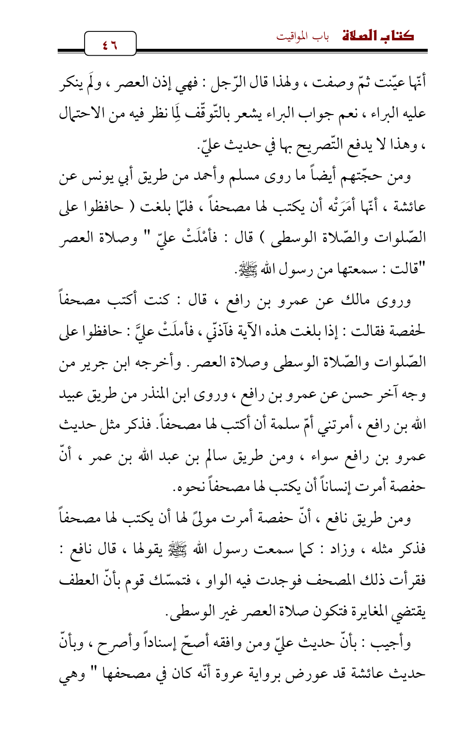ومن طريق نافع , أنّ حفصة أمرت مولىً لها أن يكتب لها مصحفاً فذكر مثله , وزاد: كما سمعت رسول الله - صلى الله عليه وسلم - يقولها , قال نافع: فقرأت ذلك المصحف فوجدت فيه الواو , فتمسّك قوم بأنّ العطف يقتضي المغايرة فتكون صلاة العصر غير الوسطى.