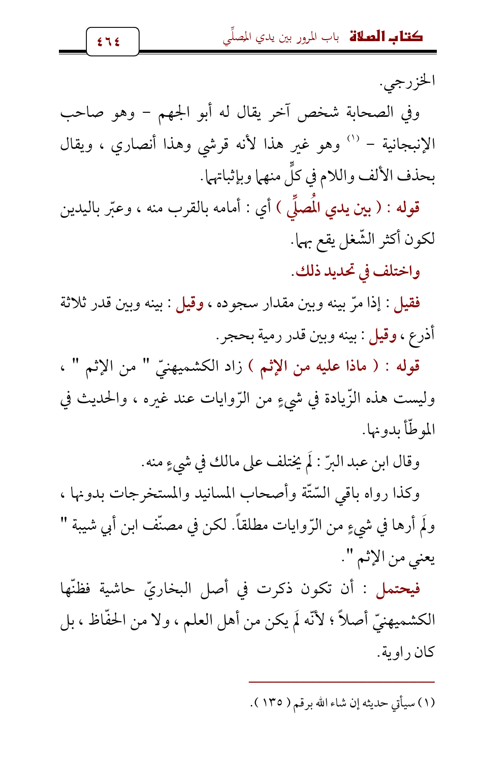 وفي الصحابة شخص آخر يقال له أبو الجهم - وهو صاحب الإنبجانية - (¬1) وهو غير هذا لأنه قرشي وهذا أنصاري , ويقال بحذف الألف واللام في كلٍّ منهما وبإثباتهما.