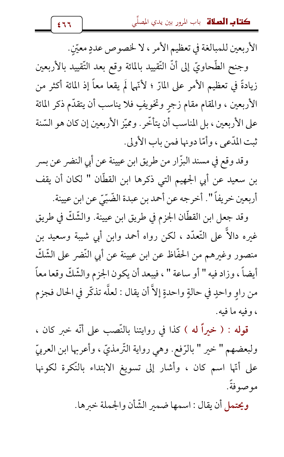 وجنح الطّحاويّ إلى أنّ التّقييد بالمائة وقع بعد التّقييد بالأربعين زيادةً في تعظيم الأمر على المارّ؛ لأنّهما لَم يقعا معاً إذ المائة أكثر من الأربعين , والمقام مقام زجرٍ وتخويفٍ فلا يناسب أن يتقدّم ذكر المائة على الأربعين، بل المناسب أن يتأخّر. ومميّز الأربعين إن كان هو السّنة ثبت المدّعى، وأمّا دونها فمن باب الأولى.