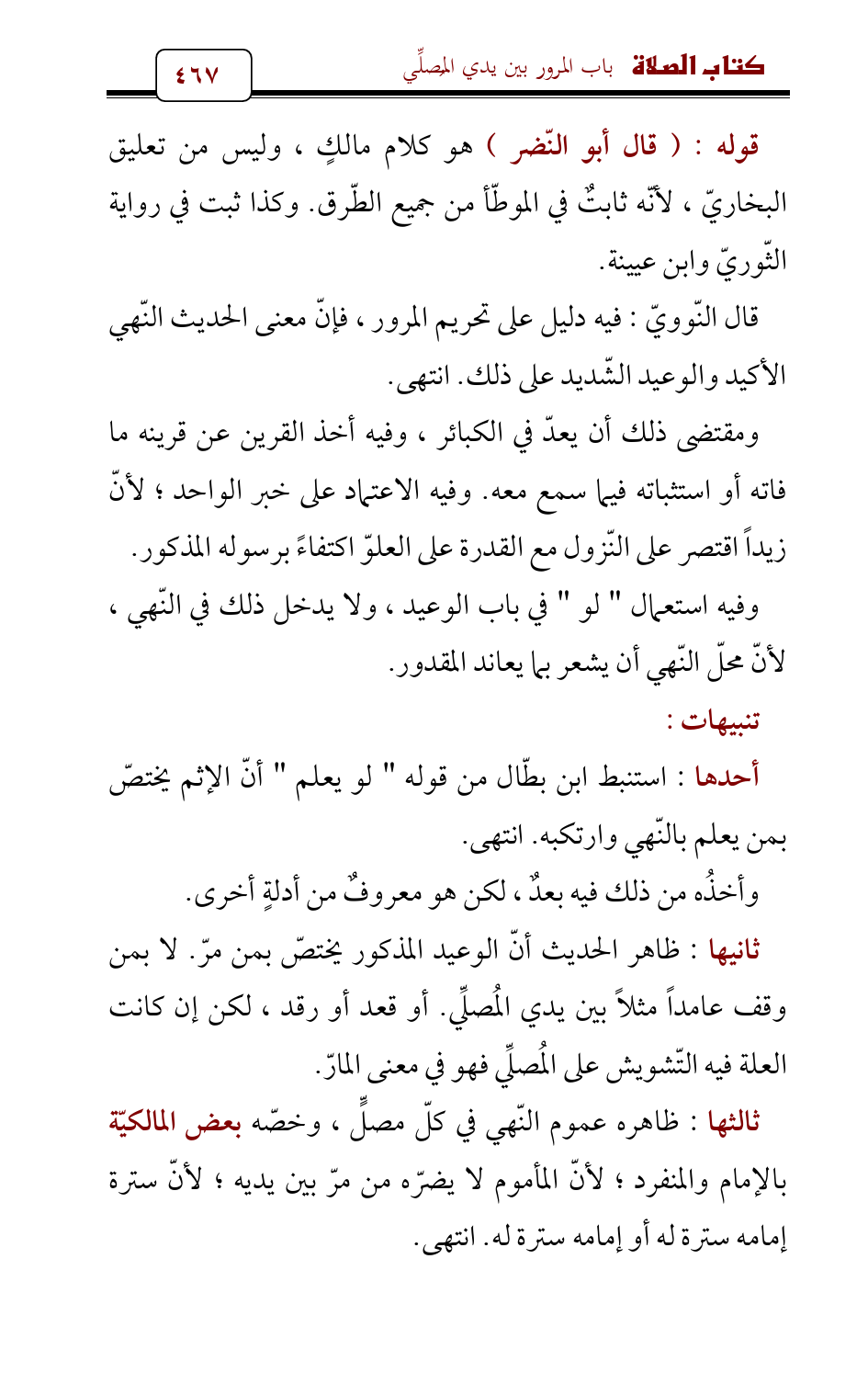 قال النّوويّ: فيه دليل على تحريم المرور، فإنّ معنى الحديث النّهي الأكيد والوعيد الشّديد على ذلك. انتهى.