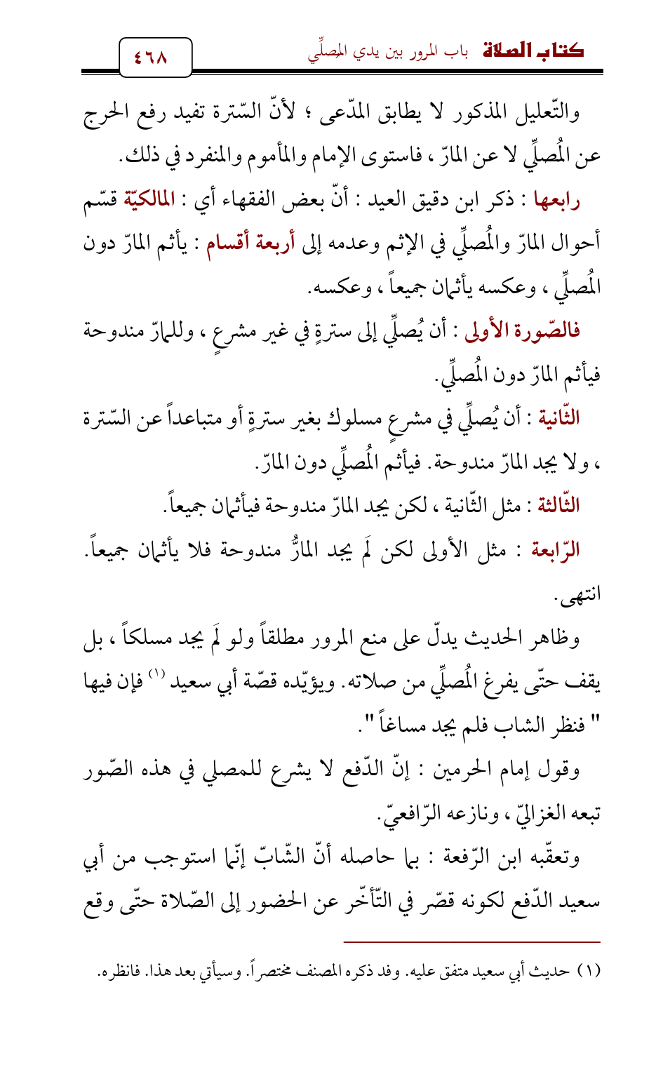 رابعها: ذكر ابن دقيق العيد: أنّ بعض الفقهاء أي: المالكيّة قسّم أحوال المارّ والمُصلِّي في الإثم وعدمه إلى أربعة أقسام: يأثم المارّ دون المُصلِّي، وعكسه يأثمان جميعاً، وعكسه.