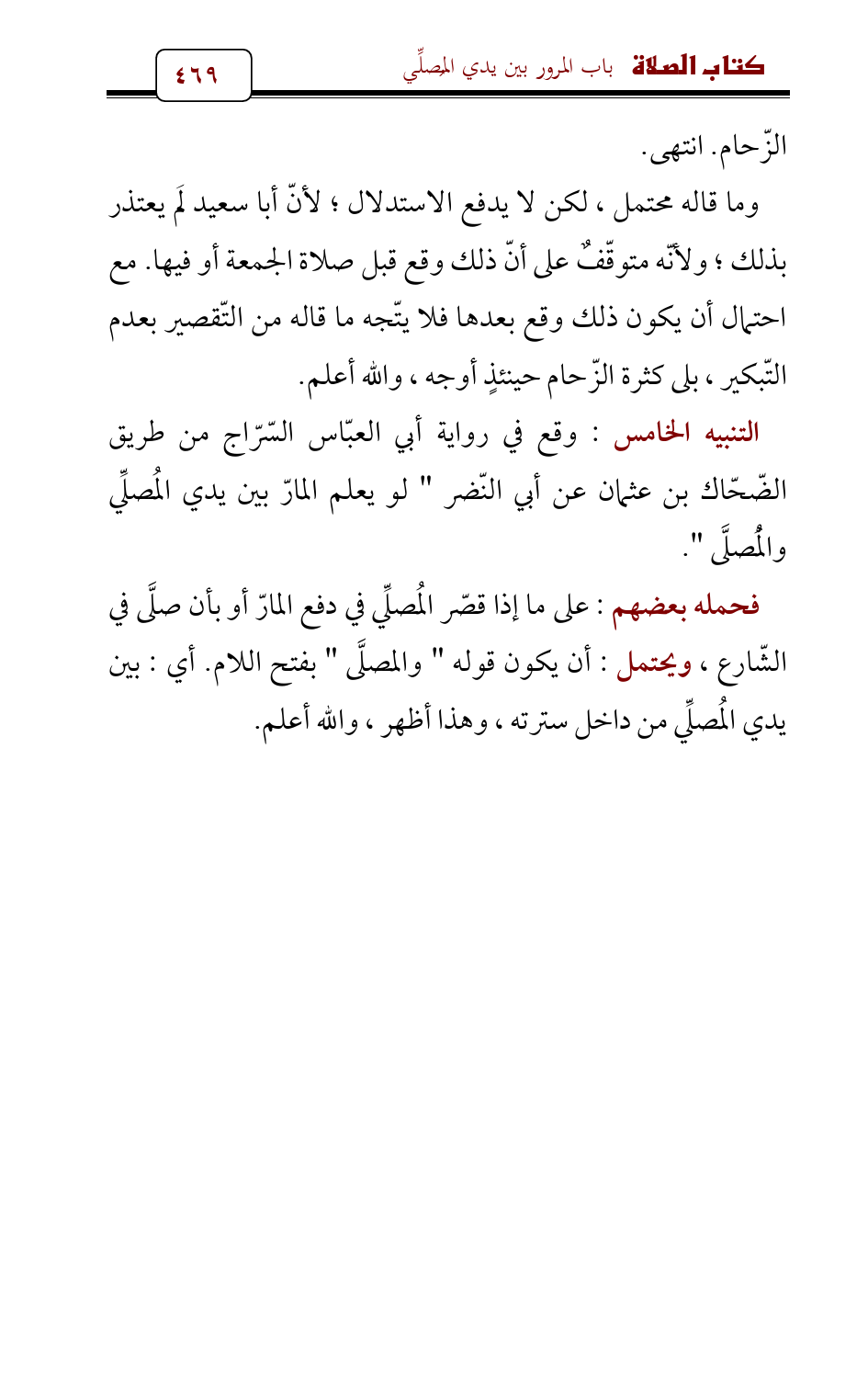 التنبيه الخامس: وقع في رواية أبي العبّاس السّرّاج من طريق الضّحّاك بن عثمان عن أبي النّضر " لو يعلم المارّ بين يدي المُصلِّي والْمُصلَّى ".