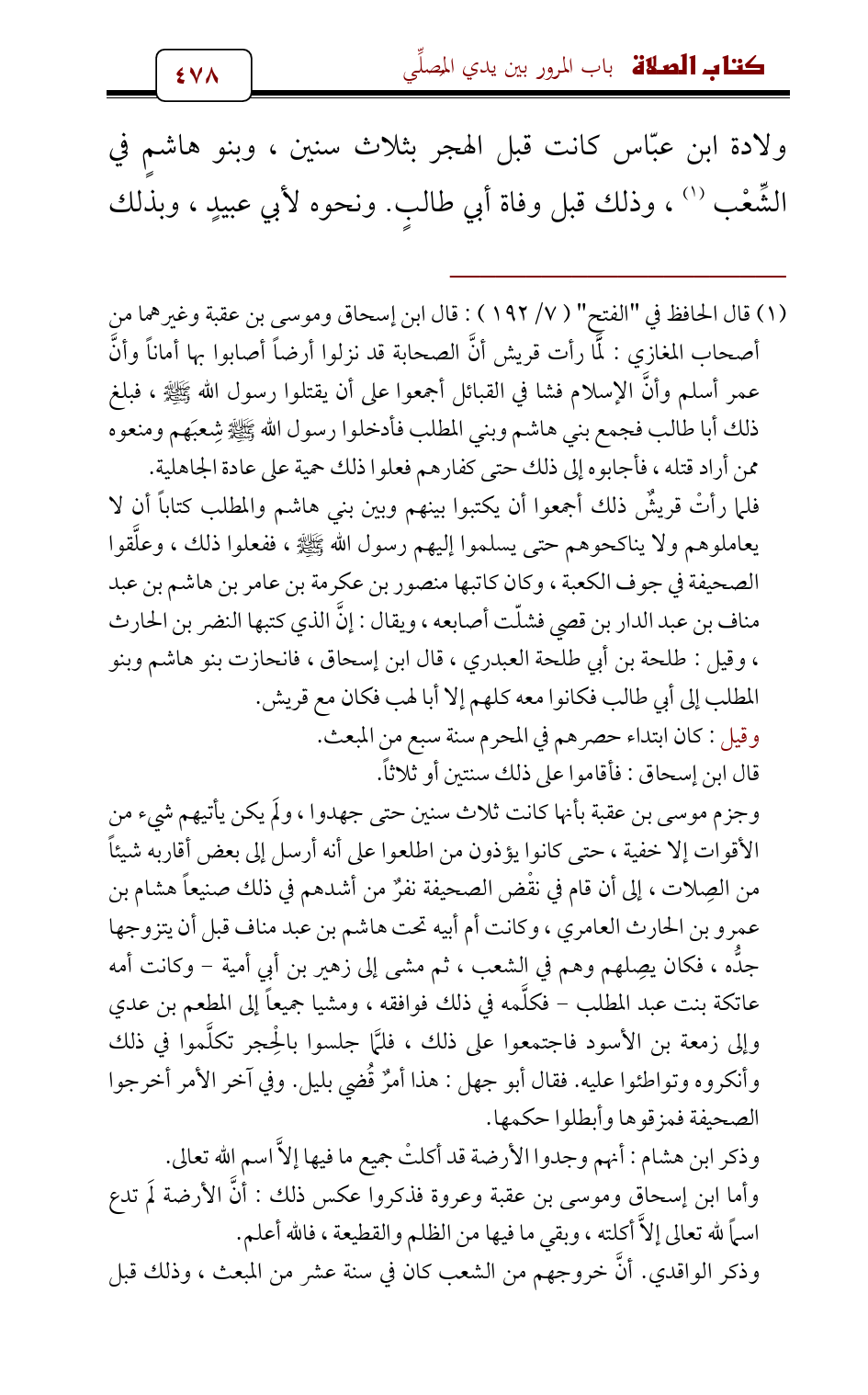 (¬1) قال الحافظ في " الفتح " (7/ 192): قال ابن إسحاق وموسى بن عقبة وغيرهما من أصحاب المغازي: لَمَّا رأت قريش أنَّ الصحابة قد نزلوا أرضاً أصابوا بها أماناً وأنَّ عمر أسلم وأنَّ الإسلام فشا في القبائل أجمعوا على أن يقتلوا رسول الله - صلى الله عليه وسلم - , فبلغ ذلك أبا طالب فجمع بني هاشم وبني المطلب فأدخلوا رسول الله - صلى الله عليه وسلم - شِعبَهم ومنعوه ممن أراد قتله، فأجابوه إلى ذلك حتى كفارهم فعلوا ذلك حمية على عادة الجاهلية.
