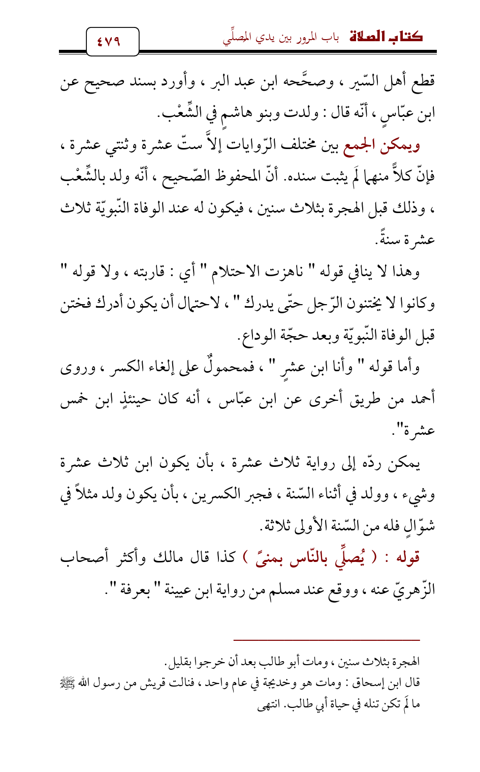 ويمكن الجمع بين مختلف الرّوايات إلاَّ ستّ عشرة وثنتي عشرة , فإنّ كلاًّ منهما لَم يثبت سنده. أنّ المحفوظ الصّحيح , أنّه ولد بالشِّعْب , وذلك قبل الهجرة بثلاث سنين , فيكون له عند الوفاة النّبويّة ثلاث عشرة سنةً.