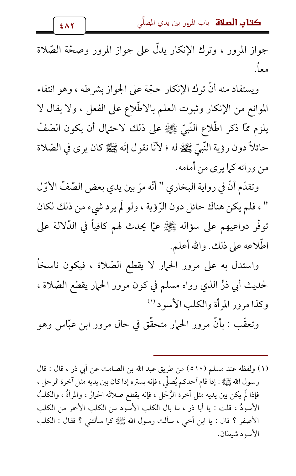 جواز المرور، وترك الإنكار يدلّ على جواز المرور وصحّة الصّلاة معاً.