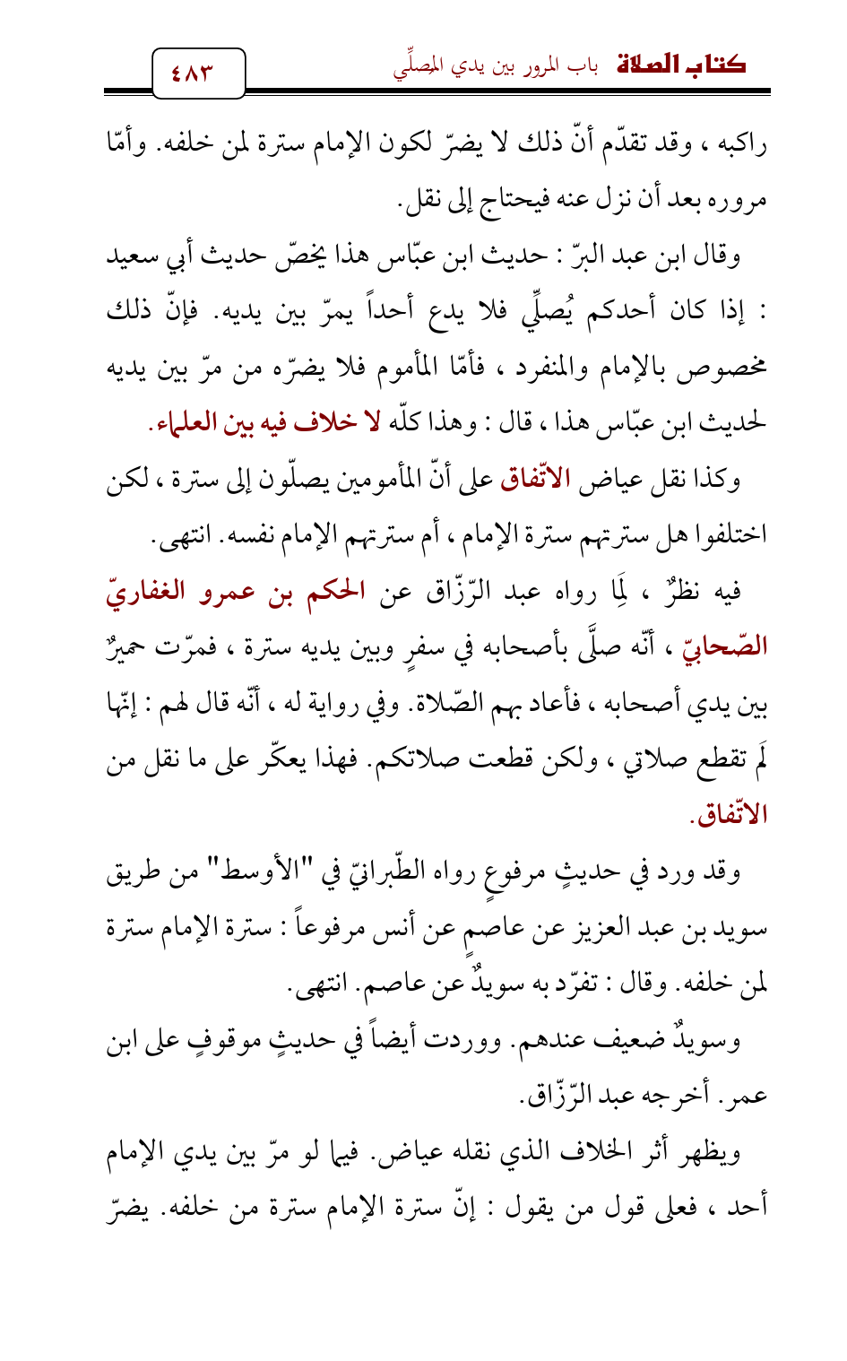 وقال ابن عبد البرّ: حديث ابن عبّاس هذا يخصّ حديث أبي سعيد: إذا كان أحدكم يُصلِّي فلا يدع أحداً يمرّ بين يديه. فإنّ ذلك مخصوص بالإمام والمنفرد، فأمّا المأموم فلا يضرّه من مرّ بين يديه لحديث ابن عبّاس هذا، قال: وهذا كلّه لا خلاف فيه بين العلماء.