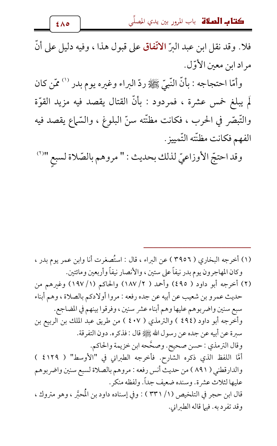 وأمّا احتجاجه: بأنّ النّبيّ - صلى الله عليه وسلم - ردّ البراء وغيره يوم بدر (¬1) ممّن كان لَم يبلغ خمس عشرة , فمردود: بأنّ القتال يقصد فيه مزيد القوّة والتّبصّر في الحرب، فكانت مظنّته سنّ البلوغ، والسّماع يقصد فيه الفهم فكانت مظنّته التّمييز.