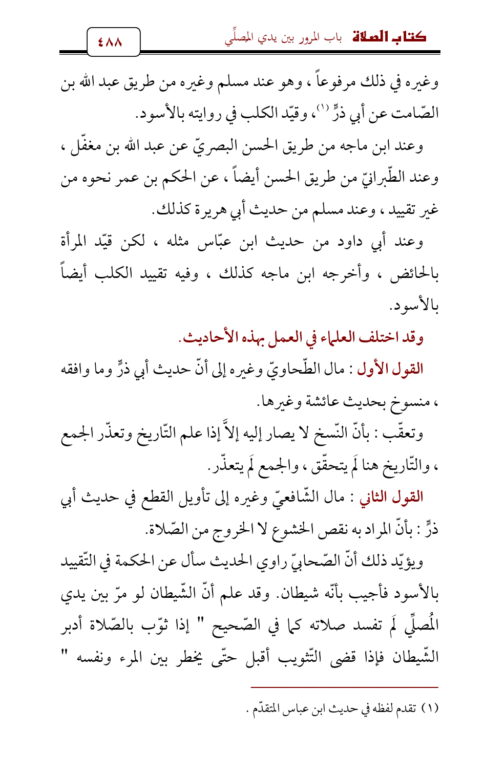 ويؤيّد ذلك أنّ الصّحابيّ راوي الحديث سأل عن الحكمة في التّقييد بالأسود فأجيب بأنّه شيطان. وقد علم أنّ الشّيطان لو مرّ بين يدي المُصلِّي لَم تفسد صلاته كما في الصّحيح " إذا ثوّب بالصّلاة أدبر الشّيطان فإذا قضى التّثويب أقبل حتّى يخطر بين المرء ونفسه "
