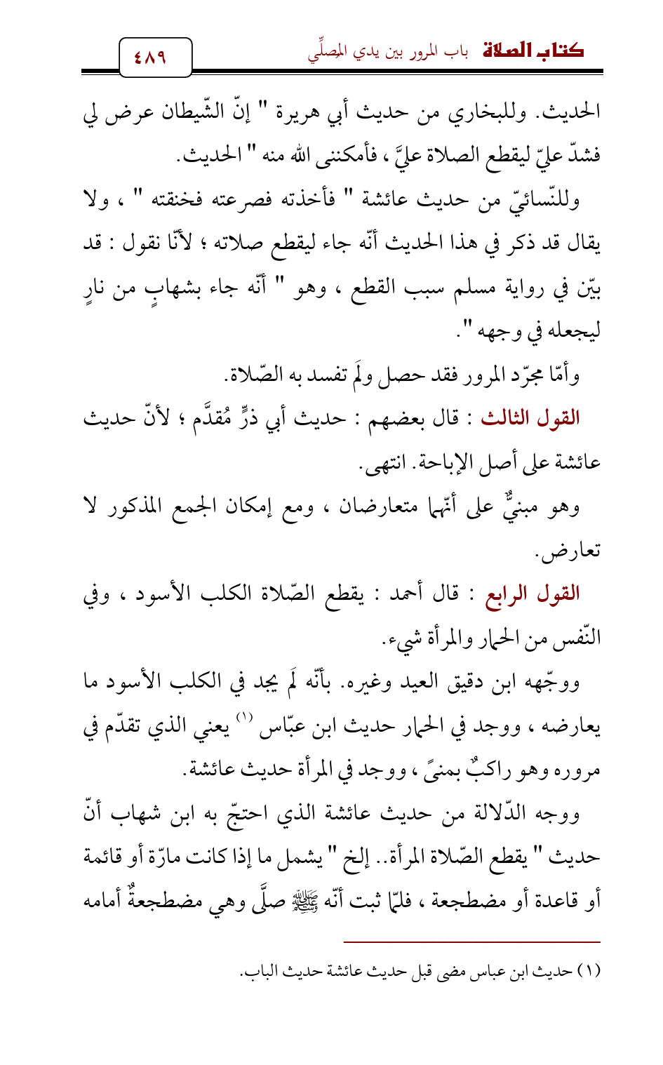 ووجّهه ابن دقيق العيد وغيره. بأنّه لَم يجد في الكلب الأسود ما يعارضه، ووجد في الحمار حديث ابن عبّاس (¬1) يعني الذي تقدّم في مروره وهو راكبٌ بمنىً، ووجد في المرأة حديث عائشة.