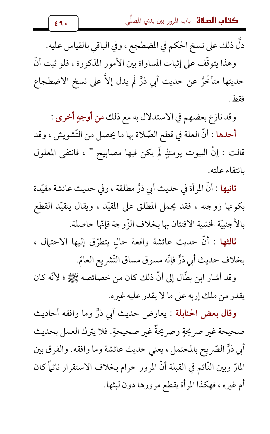 وقال بعض الحنابلة: يعارض حديث أبي ذرٍّ وما وافقه أحاديث صحيحة غير صريحةٍ وصريحةٌ غير صحيحةٍ. فلا يترك العمل بحديث أبي ذرٍّ الصّريح بالمحتمل، يعني حديث عائشة وما وافقه. والفرق بين المارّ وبين النّائم في القبلة أنّ المرور حرام بخلاف الاستقرار نائماً كان أم غيره، فهكذا المرأة يقطع مرورها دون لبثها.