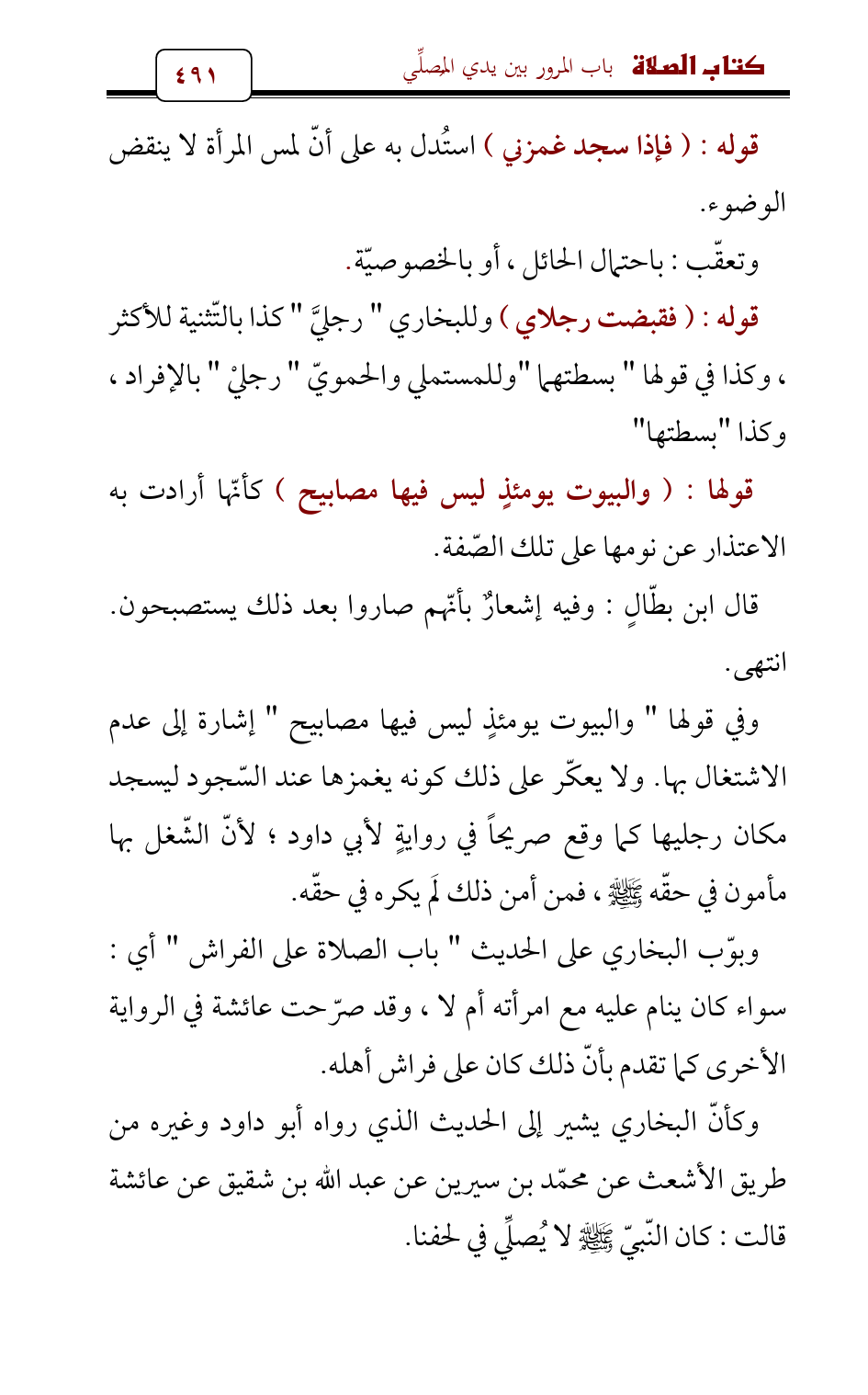 وفي قولها " والبيوت يومئذٍ ليس فيها مصابيح " إشارة إلى عدم الاشتغال بها. ولا يعكّر على ذلك كونه يغمزها عند السّجود ليسجد مكان رجليها كما وقع صريحاً في روايةٍ لأبي داود؛ لأنّ الشّغل بها مأمون في حقّه - صلى الله عليه وسلم -، فمن أمن ذلك لَم يكره في حقّه.