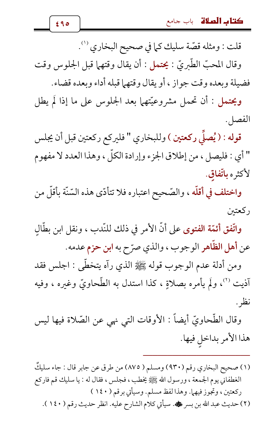ومن أدلة عدم الوجوب قوله - صلى الله عليه وسلم - الذي رآه يتخطّى: اجلس فقد آذيت (¬2) , ولَم يأمره بصلاةٍ، كذا استدل به الطّحاويّ وغيره , وفيه نظر.