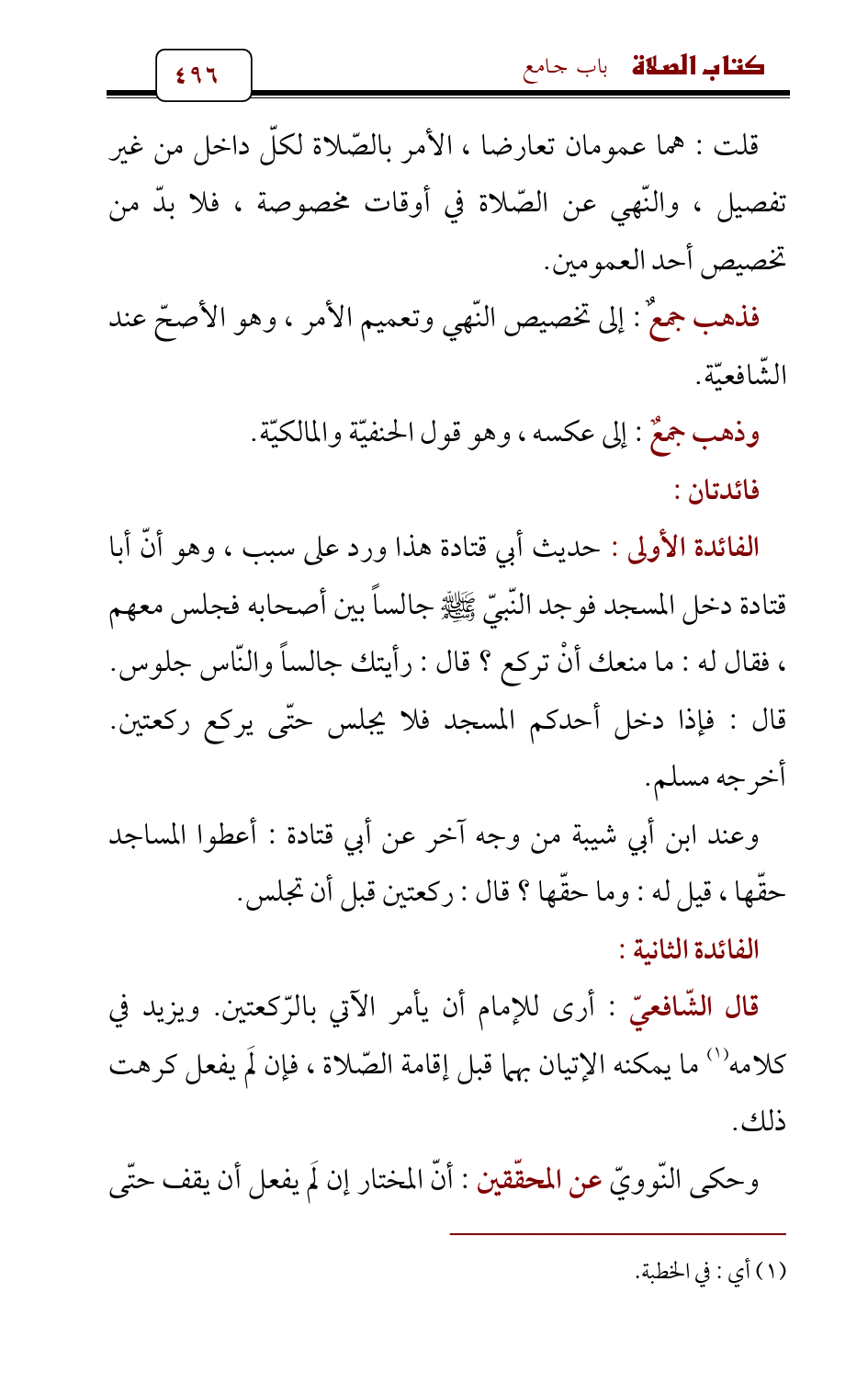 قلت: هما عمومان تعارضا، الأمر بالصّلاة لكلّ داخل من غير تفصيل، والنّهي عن الصّلاة في أوقات مخصوصة، فلا بدّ من تخصيص أحد العمومين.