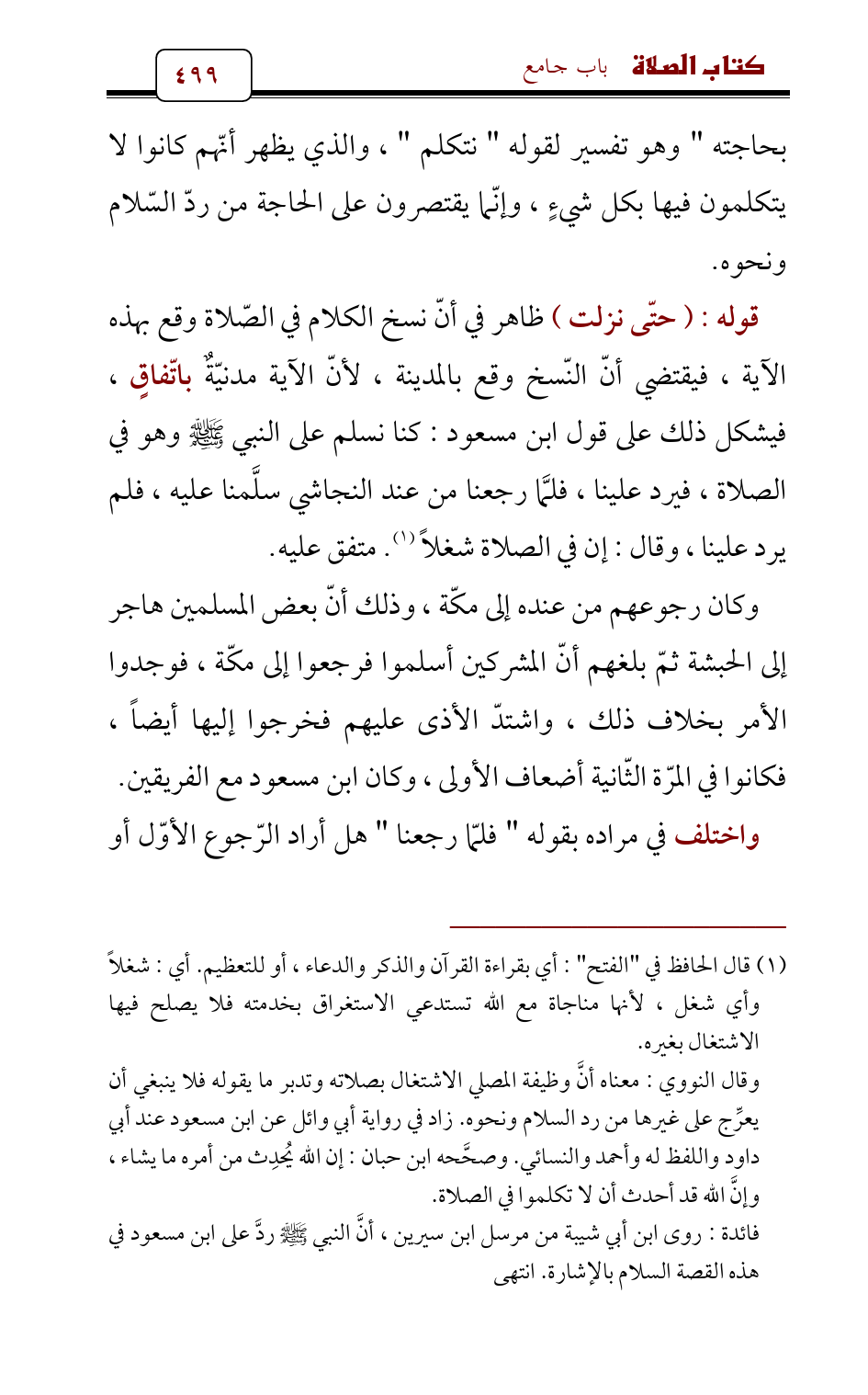 قوله: (حتّى نزلت) ظاهر في أنّ نسخ الكلام في الصّلاة وقع بهذه الآية، فيقتضي أنّ النّسخ وقع بالمدينة , لأنّ الآية مدنيّةٌ باتّفاقٍ، فيشكل ذلك على قول ابن مسعود: كنا نسلم على النبي - صلى الله عليه وسلم - وهو في الصلاة، فيرد علينا، فلمَّا رجعنا من عند النجاشي سلَّمنا عليه، فلم يرد علينا، وقال: إن في الصلاة شغلاً (¬1). متفق عليه.
