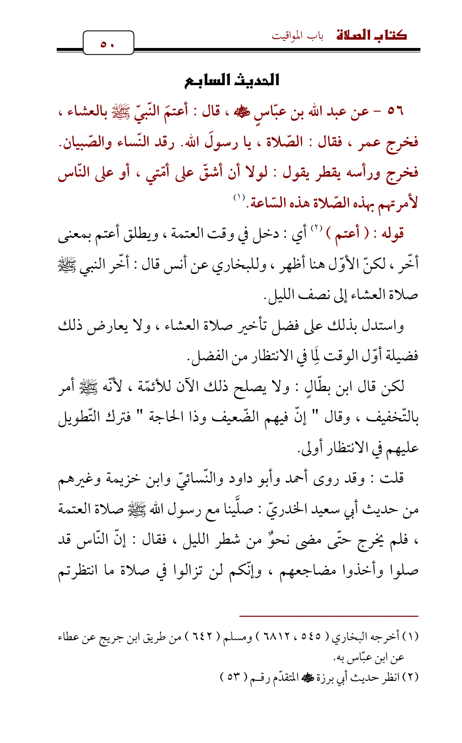 56 - عن عبد الله بن عبّاسٍ - رضي الله عنه - , قال: أعتمَ النّبيّ - صلى الله عليه وسلم - بالعشاء , فخرج عمر , فقال: الصّلاة , يا رسولَ الله. رقد النّساء والصّبيان. فخرج ورأسه يقطر يقول: لولا أن أشقّ على أمّتي , أو على النّاس لأمرتهم بهذه الصّلاة هذه السّاعة. (¬1)