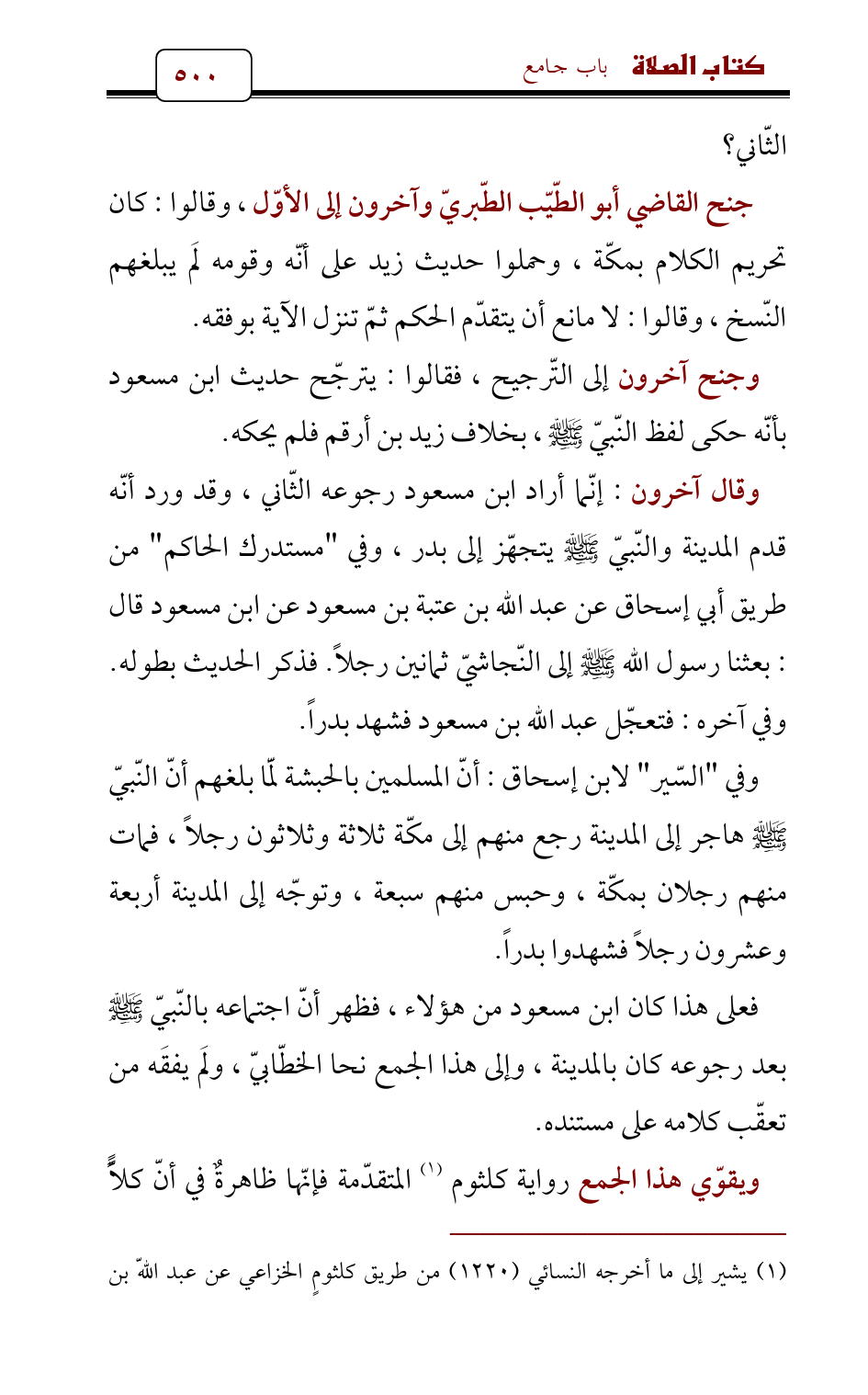 (¬1) يشير إلى ما أخرجه النسائي (1220) من طريق كلثومٍ الخزاعي عن عبد الله بن مسعودٍ قال: كنت آتي النّبيّ - صلى الله عليه وسلم - وهو يُصلِّي فأُسلّم عليه فيردّ عليّ، فأتيته فسلّمت عليه وهو يُصلِّي فلم يردّ عليّ، فلمّا سلَّّم أشار إلى القوم، فقال: إنّ الله عزّ وجلّ. يعني: أحدث في الصلاة أن لا تكلّموا إلاَّ بذكر الله، وما ينبغي لكم، وأن تقوموا لله قانتين.