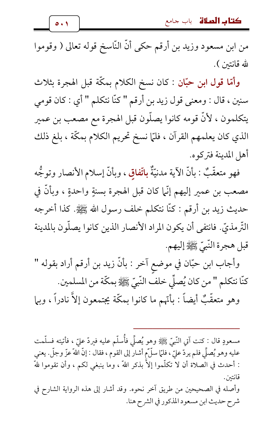وأمّا قول ابن حبّان: كان نسخ الكلام بمكّة قبل الهجرة بثلاث سنين، قال: ومعنى قول زيد بن أرقم " كنّا نتكلم " أي: كان قومي يتكلمون , لأنّ قومه كانوا يصلّون قبل الهجرة مع مصعب بن عمير الذي كان يعلمهم القرآن، فلمّا نسخ تحريم الكلام بمكّة , بلغ ذلك أهل المدينة فتركوه.