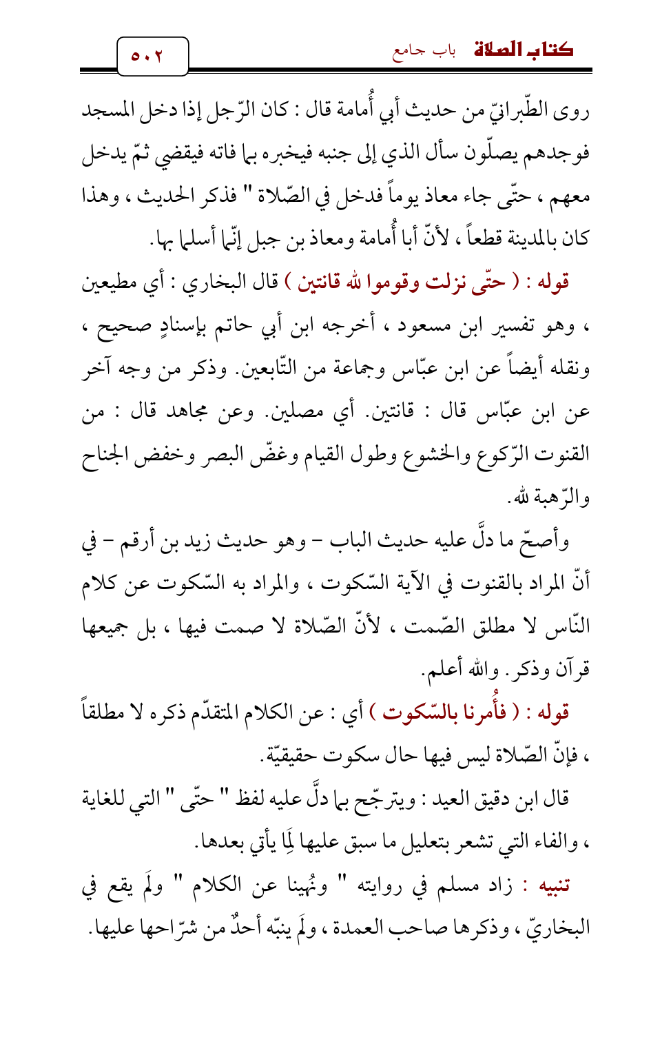 وأصحّ ما دلَّ عليه حديث الباب - وهو حديث زيد بن أرقم - في أنّ المراد بالقنوت في الآية السّكوت , والمراد به السّكوت عن كلام النّاس لا مطلق الصّمت، لأنّ الصّلاة لا صمت فيها , بل جميعها قرآن وذكر. والله أعلم.