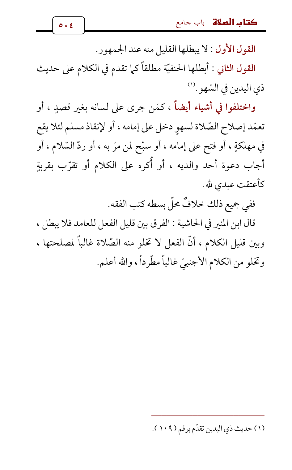 القول الثاني: أبطلها الحنفيّة مطلقاً كما تقدم في الكلام على حديث ذي اليدين في السّهو. (¬1)