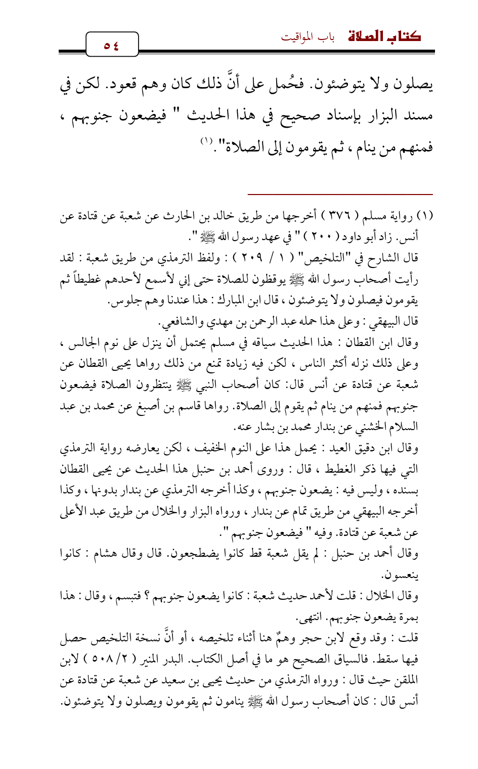 وقال ابن القطان: هذا الحديث سياقه في مسلم يحتمل أن ينزل على نوم الجالس , وعلى ذلك نزله أكثر الناس , لكن فيه زيادة تمنع من ذلك رواها يحيى القطان عن شعبة عن قتادة عن أنس قال: كان أصحاب النبي - صلى الله عليه وسلم - ينتظرون الصلاة فيضعون جنوبهم فمنهم من ينام ثم يقوم إلى الصلاة. رواها قاسم بن أصبغ عن محمد بن عبد السلام الخشني عن بندار محمد بن بشار عنه.
