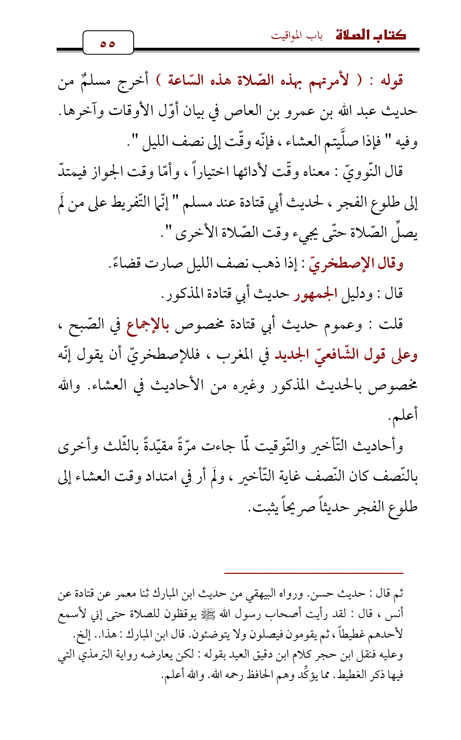 وأحاديث التّأخير والتّوقيت لَمّا جاءت مرّةً مقيّدةً بالثّلث وأخرى بالنّصف كان النّصف غاية التّأخير، ولَم أر في امتداد وقت العشاء إلى طلوع الفجر حديثاً صريحاً يثبت.