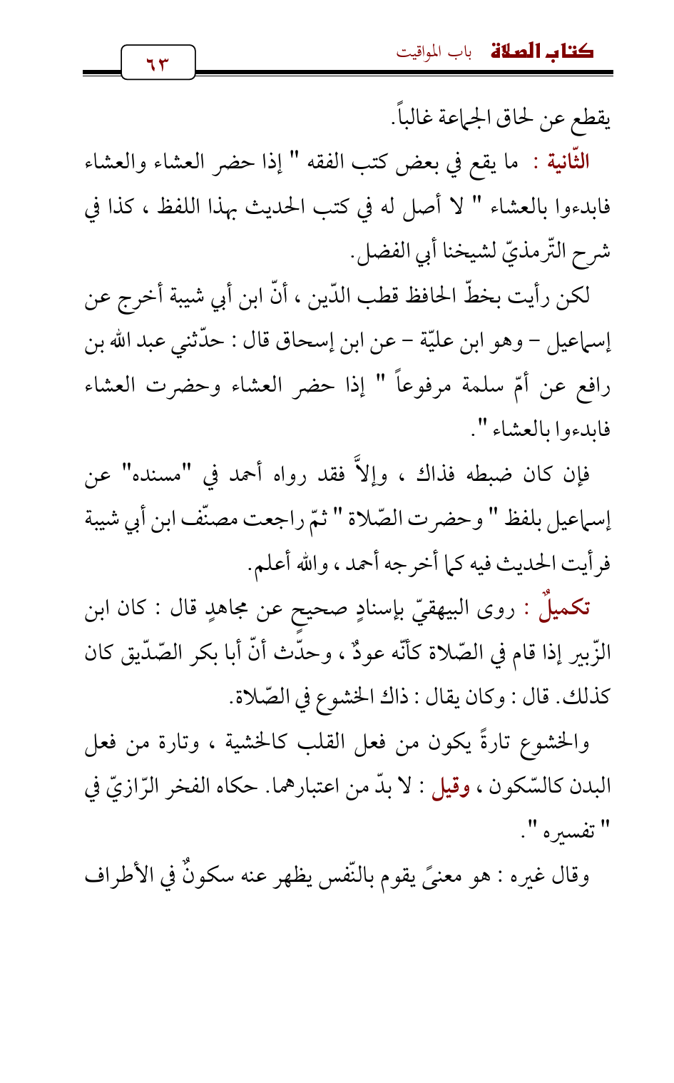 تكميلٌ: روى البيهقيّ بإسنادٍ صحيحٍ عن مجاهدٍ قال: كان ابن الزّبير إذا قام في الصّلاة كأنّه عودٌ , وحدّث أنّ أبا بكر الصّدّيق كان كذلك. قال: وكان يقال: ذاك الخشوع في الصّلاة.