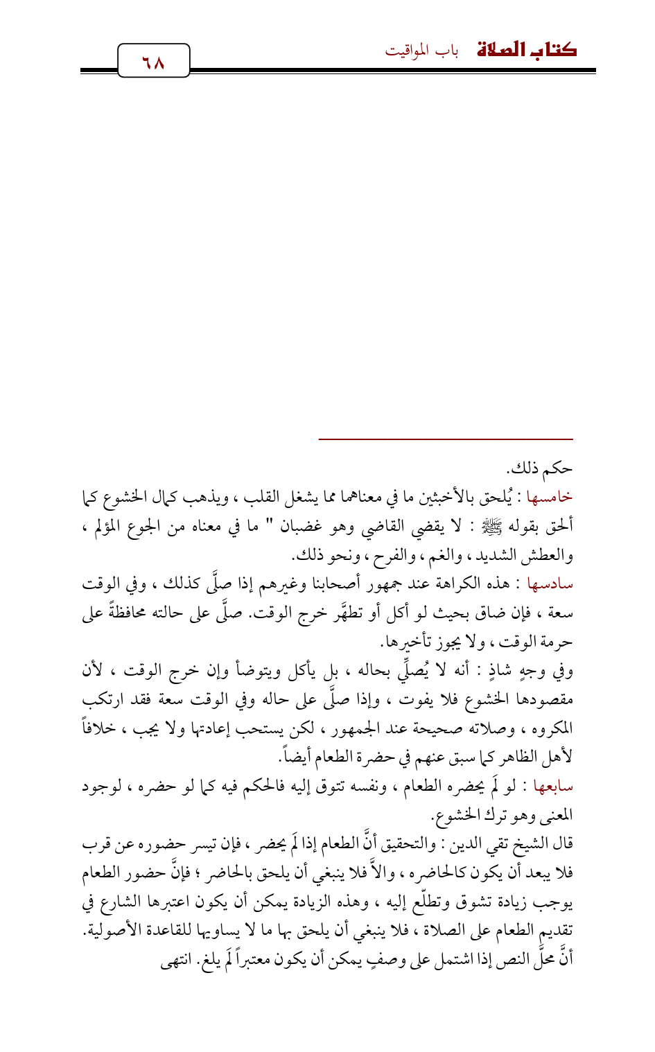 سادسها: هذه الكراهة عند جمهور أصحابنا وغيرهم إذا صلَّى كذلك , وفي الوقت سعة , فإن ضاق بحيث لو أكل أو تطهَّر خرج الوقت. صلَّى على حالته محافظةً على حرمة الوقت , ولا يجوز تأخيرها.