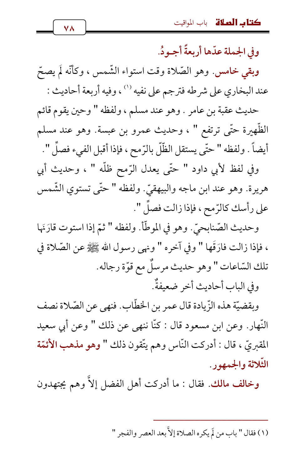 وبقضيّة هذه الزّيادة قال عمر بن الخطّاب. فنهى عن الصّلاة نصف النّهار. وعن ابن مسعود قال: كنّا ننهى عن ذلك " وعن أبي سعيد المقبريّ , قال: أدركت النّاس وهم يتّقون ذلك " وهو مذهب الأئمّة الثّلاثة والجمهور.