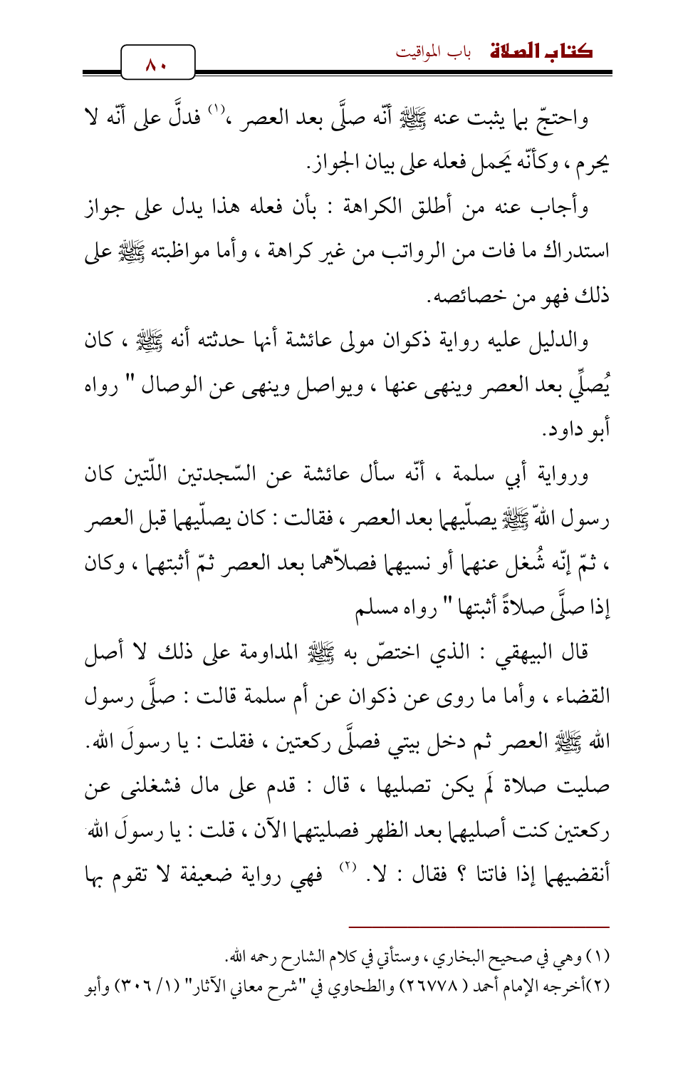 قال البيهقي: الذي اختصّ به - صلى الله عليه وسلم - المداومة على ذلك لا أصل القضاء، وأما ما روى عن ذكوان عن أم سلمة قالت: صلَّى رسول الله - صلى الله عليه وسلم - العصر ثم دخل بيتي فصلَّى ركعتين , فقلت: يا رسولَ الله. صليت صلاة لَم يكن تصليها , قال: قدم على مال فشغلنى عن ركعتين كنت أصليهما بعد الظهر فصليتهما الآن , قلت: يا رسولَ الله. أنقضيهما إذا فاتتا؟ فقال: لا. (¬2) فهي رواية ضعيفة لا تقوم بها