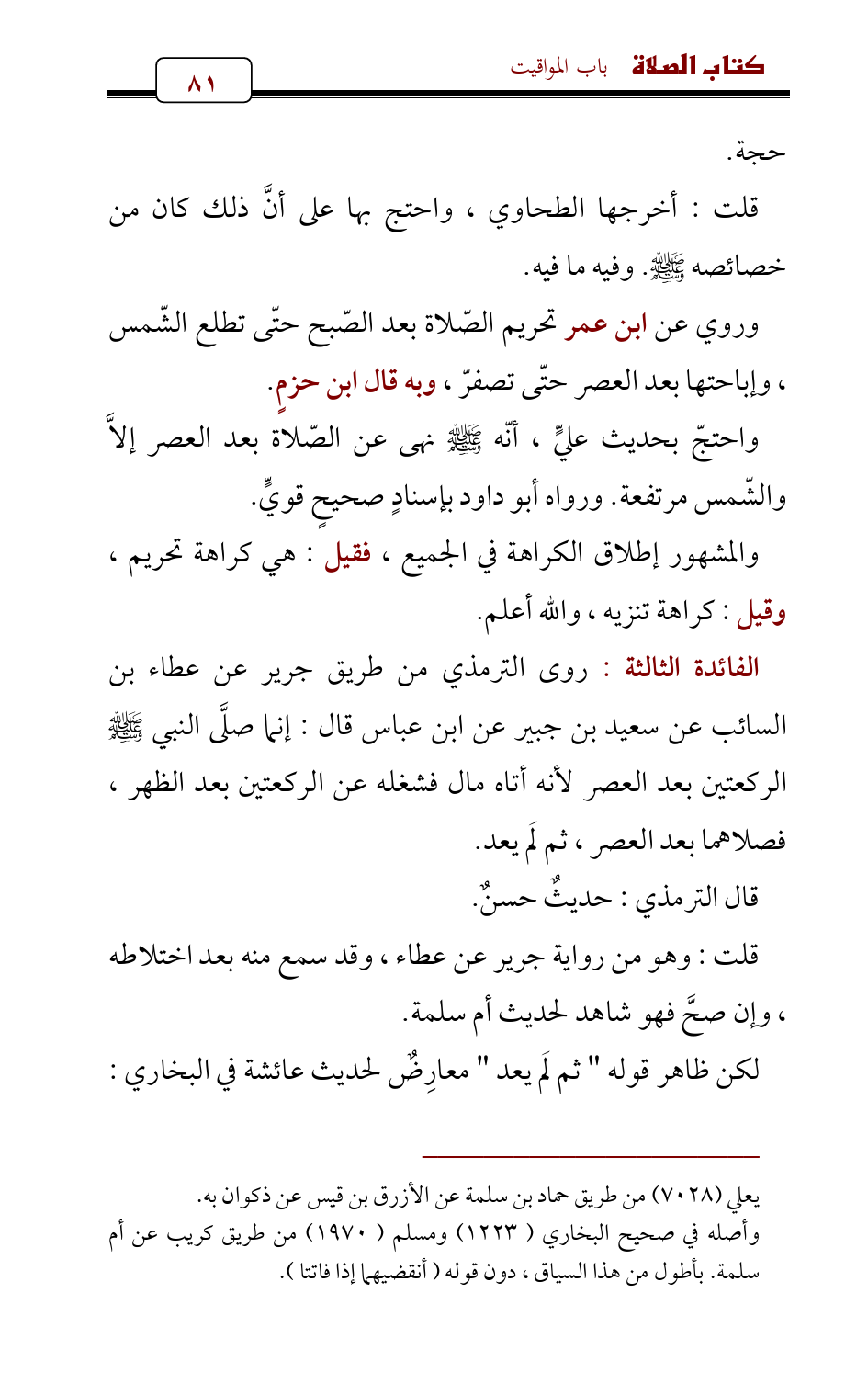 واحتجّ بحديث عليٍّ , أنّه - صلى الله عليه وسلم - نهى عن الصّلاة بعد العصر إلاَّ والشّمس مرتفعة. ورواه أبو داود بإسنادٍ صحيحٍ قويٍّ.