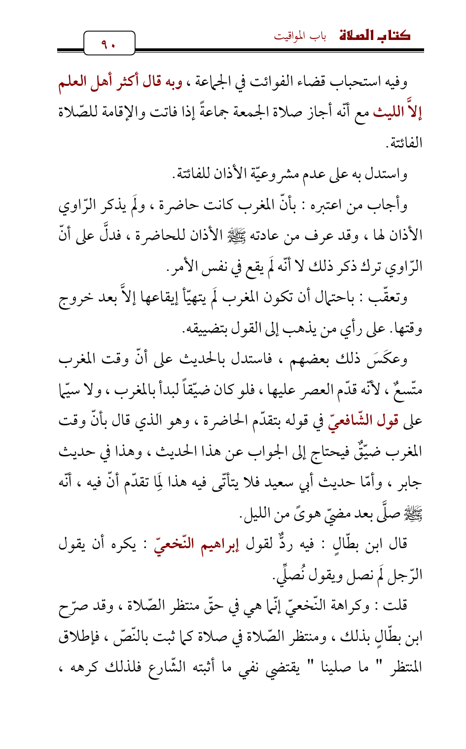 وفيه استحباب قضاء الفوائت في الجماعة , وبه قال أكثر أهل العلم إلاَّ الليث مع أنّه أجاز صلاة الجمعة جماعةً إذا فاتت والإقامة للصّلاة الفائتة.