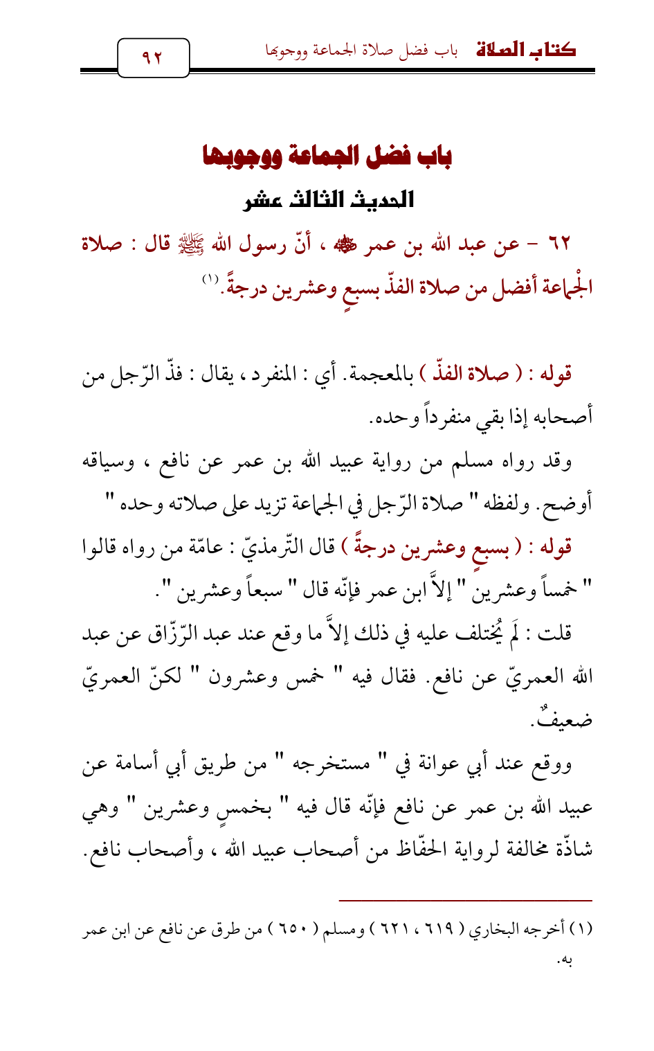 62 - عن عبد الله بن عمر - رضي الله عنه - , أنّ رسول الله - صلى الله عليه وسلم - قال: صلاة الْجماعة أفضل من صلاة الفذّ بسبعٍ وعشرين درجةً. (¬1)