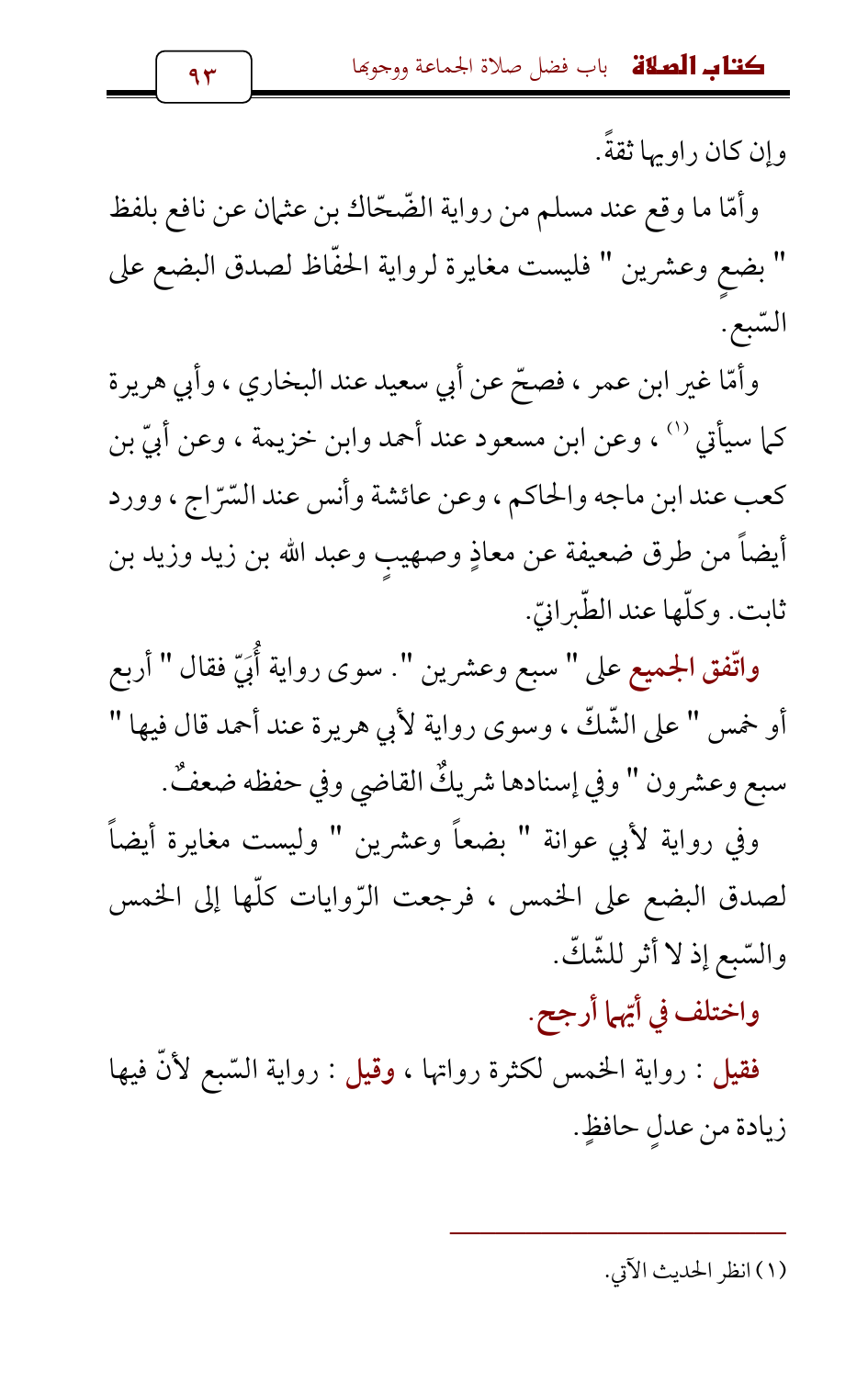 وأمّا ما وقع عند مسلم من رواية الضّحّاك بن عثمان عن نافع بلفظ " بضعٍ وعشرين " فليست مغايرة لرواية الحفّاظ لصدق البضع على السّبع.