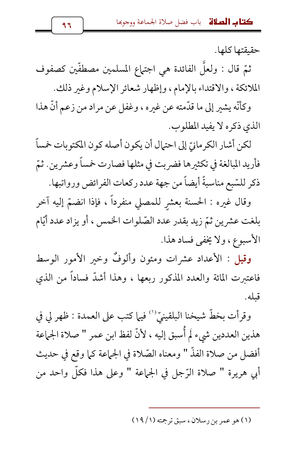 وقرأت بخطّ شيخنا البلقينيّ (¬1) فيما كتب على العمدة: ظهر لي في هذين العددين شيء لَم أُسبق إليه، لأنّ لفظ ابن عمر " صلاة الجماعة أفضل من صلاة الفذّ " ومعناه الصّلاة في الجماعة كما وقع في حديث أبي هريرة " صلاة الرّجل في الجماعة " وعلى هذا فكلّ واحد من