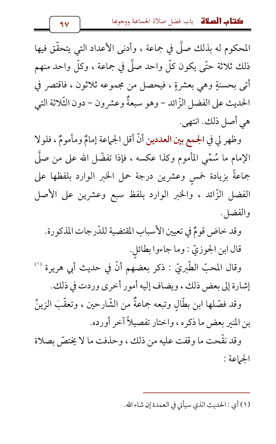 وظهر لي في الجمع بين العددين أنّ أقل الجماعة إمامٌ ومأمومٌ، فلولا الإمام ما سُمِّي المأموم وكذا عكسه، فإذا تفضّل الله على من صلَّى جماعةً بزيادة خمسٍ وعشرين درجة حمل الخبر الوارد بلفظها على الفضل الزّائد، والخبر الوارد بلفظ سبع وعشرين على الأصل والفضل.