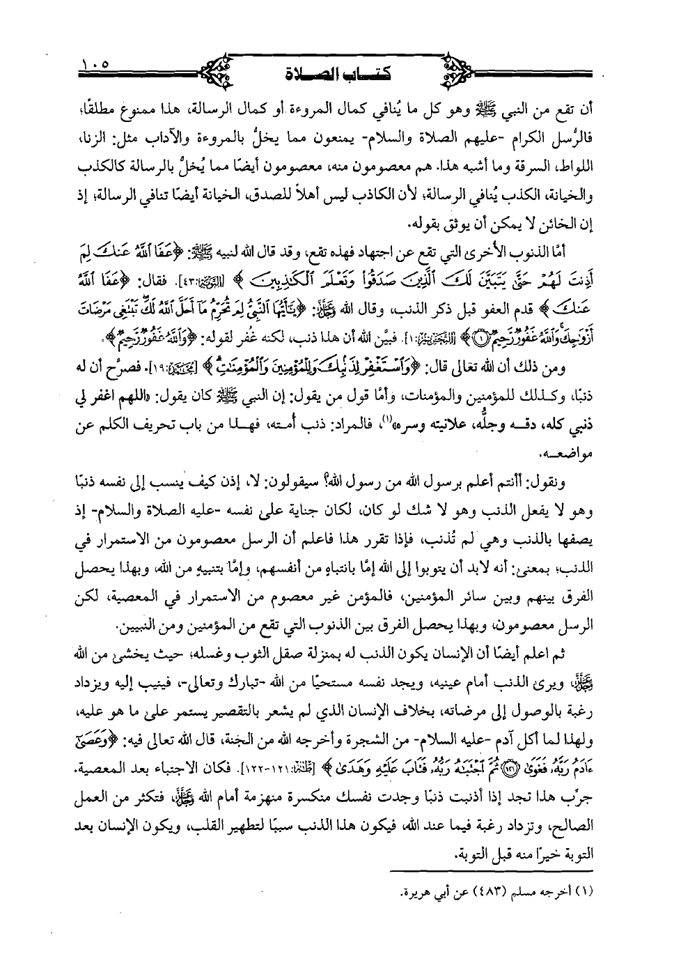 ومن ذلك أن الله تعالى قال: {واسْتَغْفِرْ لِذَنْبِكَ ولِلْمُؤْمِنِينَ والْمُؤْمِنَاتِ} [محمد: 19]. فصرح أن له ذنبًا، وكذلك للمؤمنين والمؤمنات، وأما قول من يقول: إن النبي صلى الله عليه وسلم كان يقول: "اللهم اغفر لي ذنبي كله، دقه وجله، علانيته وسره"، فالمراد: ذنب أمته، فهذا من باب تحريف الكلم عن مواضعه.