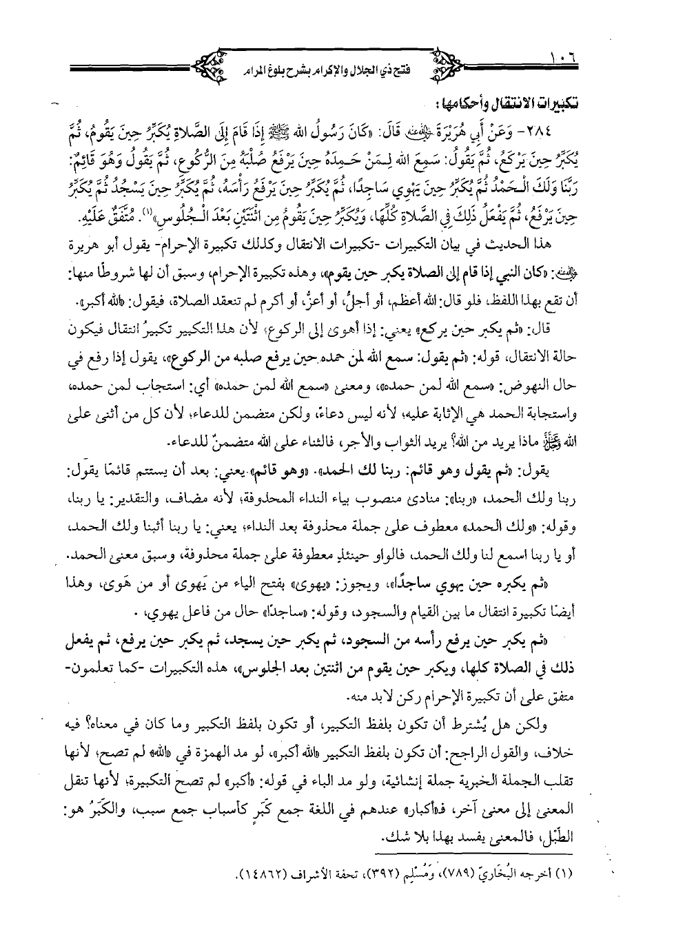 "ثم يكبر حين يرفع رأسه من السجود، ثم يكبر حين يسجد، ثم يكبر حين يرفع، ثم يفعل ذلك في الصلاة كلها، ويكبر حين يقوم من اثنتين بعد الجلوس"، هذه التكبيرات- كما تعلمون- متفق على أن تكبيرة الإحرام ركن لابد منه.