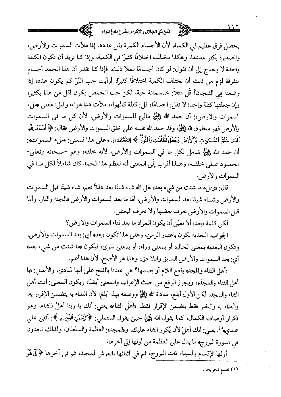 يحصل فرق عظيم في الكمية؛ لأن الأجسام الكبيرة يقل عددها إذا ملأت السموات والأرض، والصغيرة يكثر عددها، وهكذا يختلف اختلافًا كثيرًا في الكمية، وإذا كنا نريد أن تكون الكتلة واحدة لا يحتاج إلى أن نقول: لو كان أجسامًا لملأ ذلك، فإذا كنا نقدر أن هذا الحمد أجسام متفرقة لزم من ذلك أن تختلف الكمية اختلافًا كثيرًا، أرأيت حب البر كم يكون عدده إذا وضعته في الفنجان؟ قل مثلًا: خمسمائة حبه، لكن حب الحمص يكون أقل من هذا بكثير، وإن جعلتها كتلة واحدة لا تقل: أجسامًا، قل: كتلة كالهواء، ملأت هذا هواء، وقيل: معنى ((ملء السموات والأرض)): أن حمد الله عز وجل مالئ للسموات والأرض؛ لأن كل ما في السموات والأرض فهو مخلوق لله عز وجل، وقد حمد الله نفسه على خلق السموات والأرض فقال: {الحمد لله الذي خلق السموات والأرض وجعل الظلمات والنور} [الأنعام: 1]. وعلى هذا فمعنى: ((ملء السموات)): أن حمد الله عز وجل شامل لكل ما في السموات والأرض؛ لأنه خلقه، وهو- سبحانه وتعالى- محمود على خلقه، وهذا أقرب إلى المعنى أنه لعظم هذا الحمد كان شاملًا لكل ما في السموات والأرض.