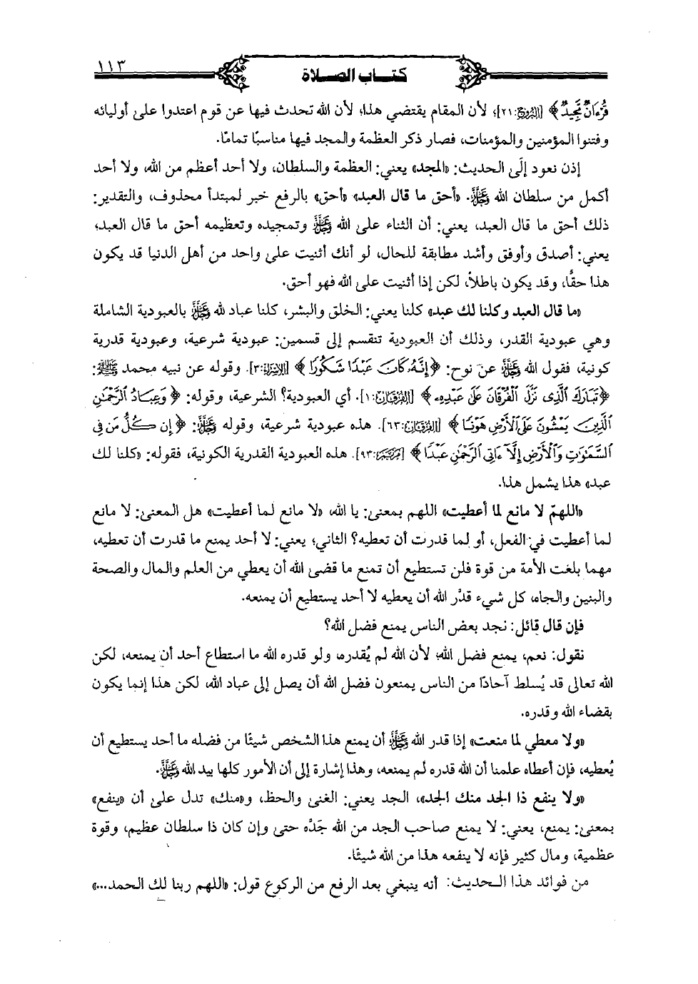 ((ما قال العبد وكلنا لك عبد)) كلنا يعني: الخلق والبشر، كلنا عباد الله عز وجل بالعبودية الشاملة وهي عبودية القدر، وذلك أن العبودية تنقسم إلى قسمين: عبودية شرعية، وعبودية قدرية كونية، فقول الله عز وجل عن نوح: {إنه كان عبدا شكورا} [الإسراء: 3]. وقوله عن نبيه محمد صلى الله عليه وسلم {تبارك الذي نزل الفرقان على عبده} [الفرقان: 1]. أي العبودية؟ الشرعية، وقوله: {وعباد الرحمن الذين يمشون على الأرض هونًا} [الفرقان: 63]. هذه عبودية شرعية، وقوله عز وجل: {إن كل من في السموات والأرض إلا أتي الرحمن عبدا} [مريم: 93]. هذه العبودية القدرية الكونية، فقوله: ((كلنا لك عبد)) هذا يشمل هذا.