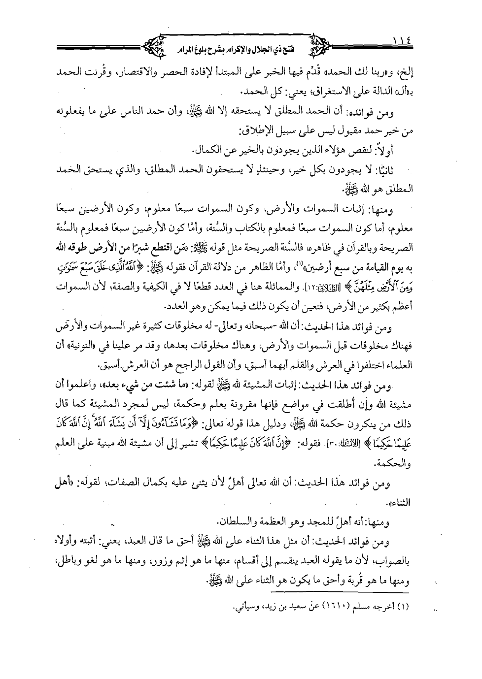 ومن فوائد هذا الحديث: أن الله- سبحانه وتعالى- له مخلوقات كثيرة غير السموات والأرض فهناك مخلوقات قبل السموات والأرض، وهناك مخلوقات بعدها، وقد مر علينا في ((النونية)) أن العلماء اختلفوا في العرش والقلم أيهما أسبق، وأن القول الراجح هو أن العرش أسبق.