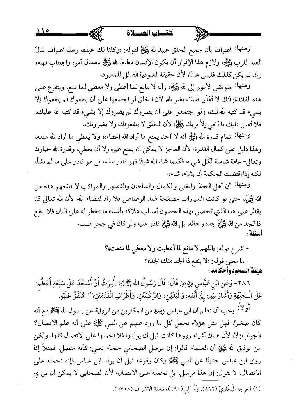 286 - وعن ابن عباس رضي الله عنهما قال: قال رسول الله صلى الله عليه وسلم: ((أمرت أن أسجد على سبعة أعظم: على الجبهة وأشار بيده إلى أنفه، واليدين، والركبتين، وأطراف القدمين)) 1. متفق عليه.