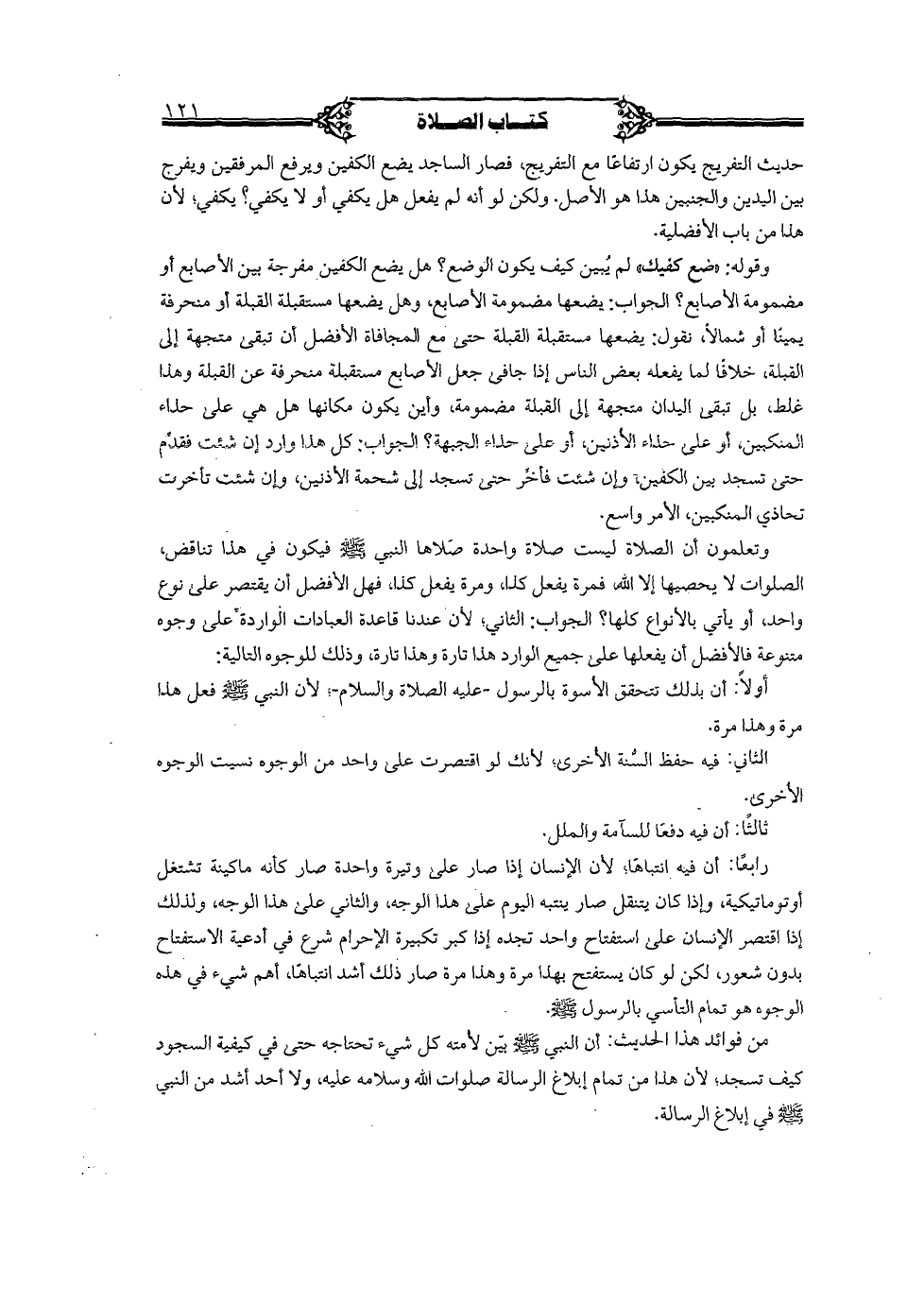 وتعلمون أن الصلاة ليست صلاة واحدة صلاها النبي صلى الله عليه وسلم فيكون في هذا تناقض، الصلوات لا يحصيها إلا الله، فمرة يفعل كذا، ومرة يفعل كذا، فهل الأفضل أن يقتصر على نوع واحد، أو يأتي بالأنواع كلها؟ الجواب: الثاني؛ لأن عندنا قاعدة العبادات الواردة على وجوه متنوعة فالأفضل أن يفعلها على جميع الوارد هذا تارة وهذا تارة، وذلك للوجوه التالية: