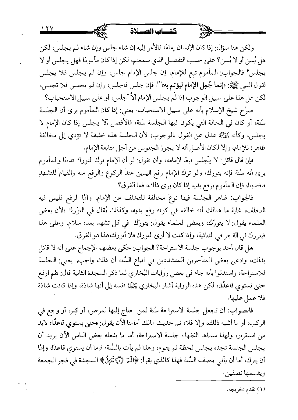 ولكن هنا سؤال: إذا كان الإنسان إماما فالأمر إليه إن شاء جلس وإن شاء لم يجلس، لكن هل يسن أو لا يسن؟ على حسب التفصيل الذي سمعتم، لكن إذا كان مأمومًا فهل يجلس أو لا يجلس؟ فالجواب: المأموم نبع للإمام، إن جلس الإمام جلس، وإن لم يجلس فلا يجلس لقول النبي صلى الله عليه وسلم: ((إنما جعل الإمام ليؤتم به)). فإن جلس فاجلس، وإن لم يجلس فلا تجلس، لكن هل هذا على سبيل الوجوب إذا لم يجلس الإمام ألا أجلس، أو على سبيل الاستحباب؟